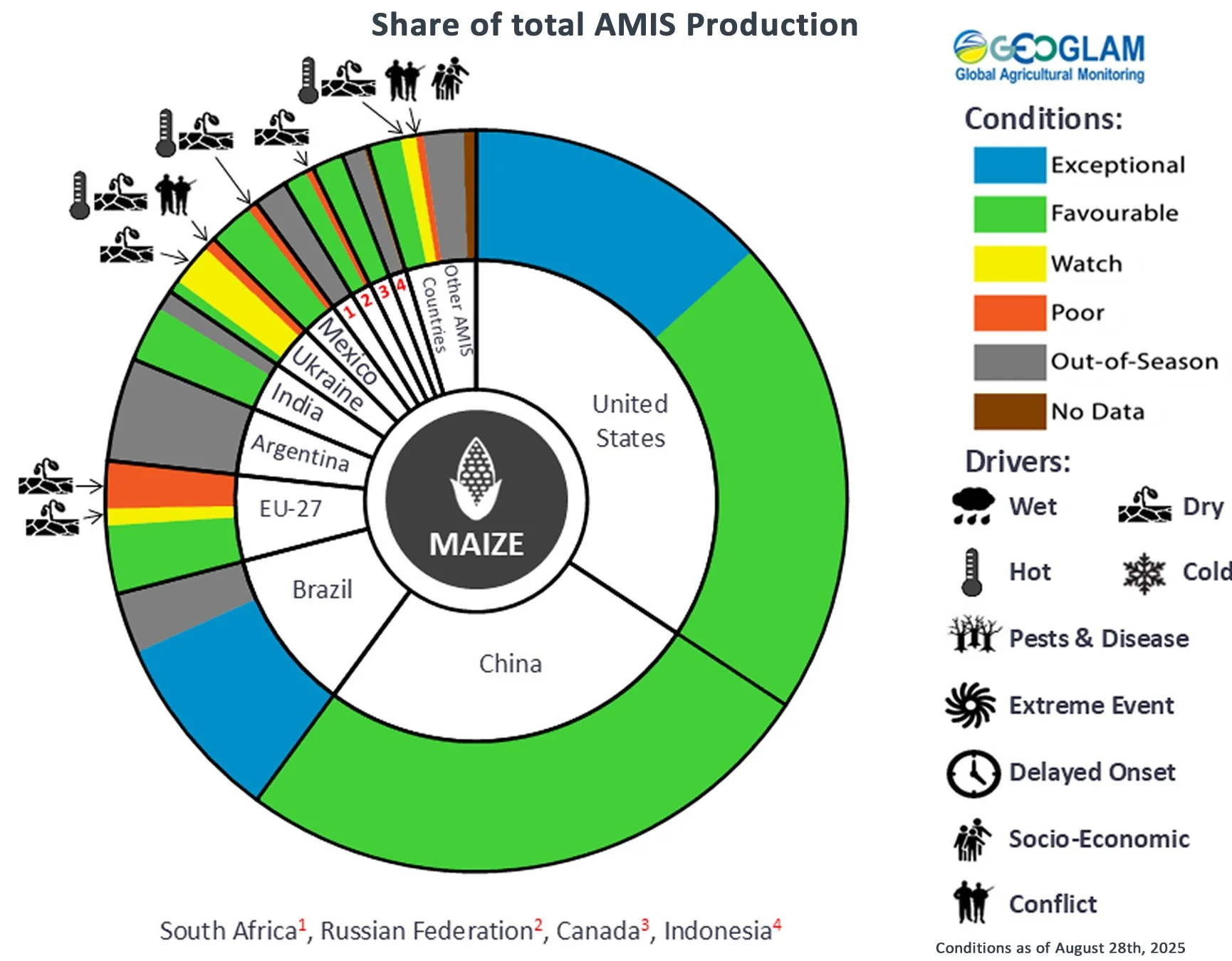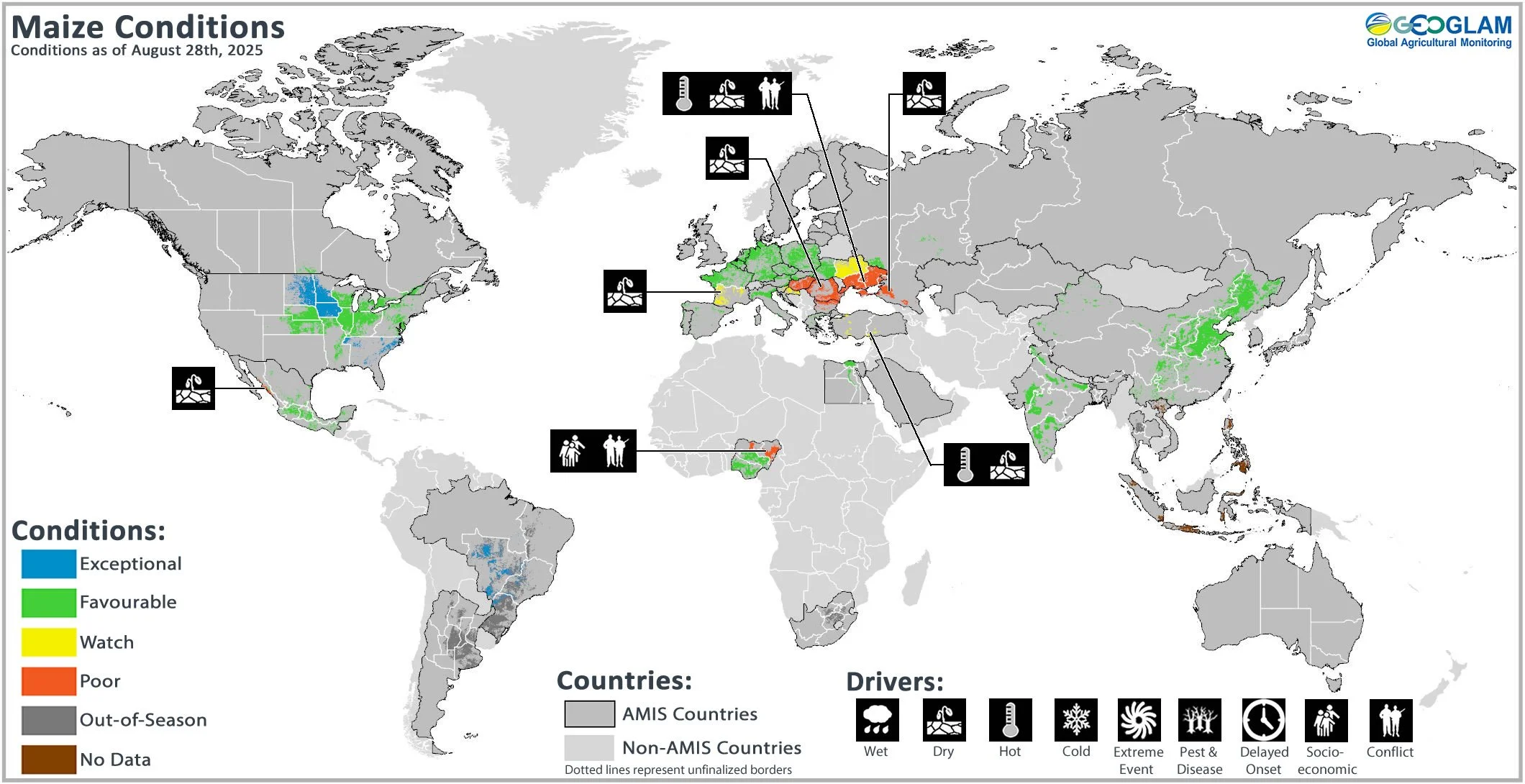 Maize crop conditions over the main growing areas are based on national and regional crop analyst inputs and earth observation data. Crop condition information is based on information as of August 28th. Where crops are in conditions other than favourable, the climatic drivers responsible for those conditions are displayed. Crop Season Specific Maps can be found in Appendix 2.