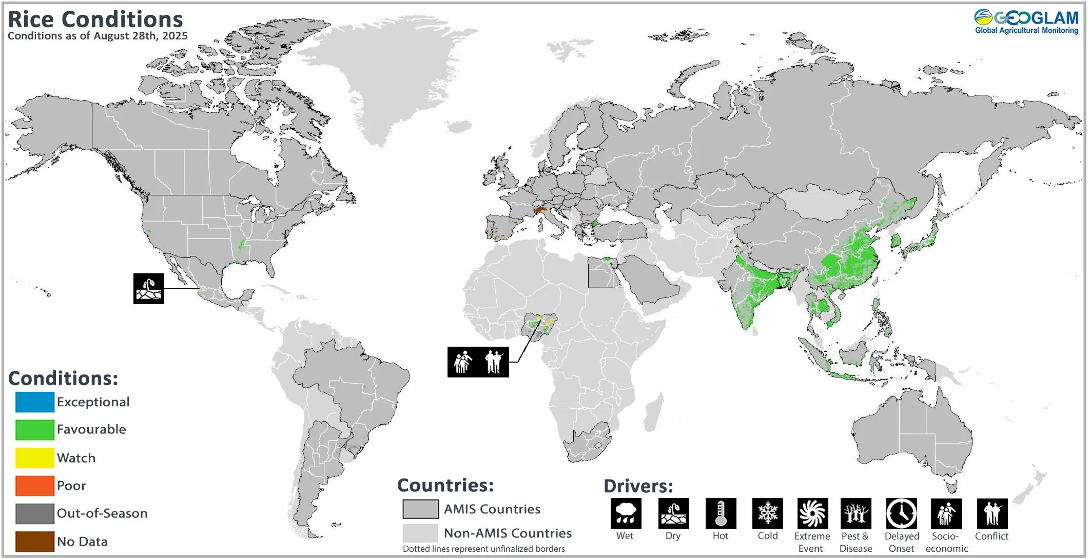 Rice crop conditions over the main growing areas are based on national and regional crop analyst inputs and earth observation data. Crop condition information is based on information as of August 28th. Where crops are in conditions other than favourable, the climatic drivers responsible for those conditions are displayed. Crop Season Specific Maps can be found in Appendix 2.