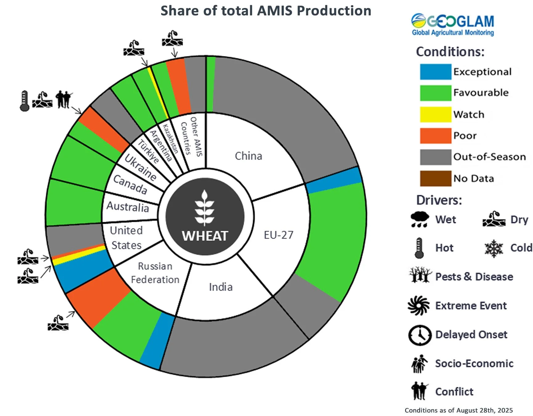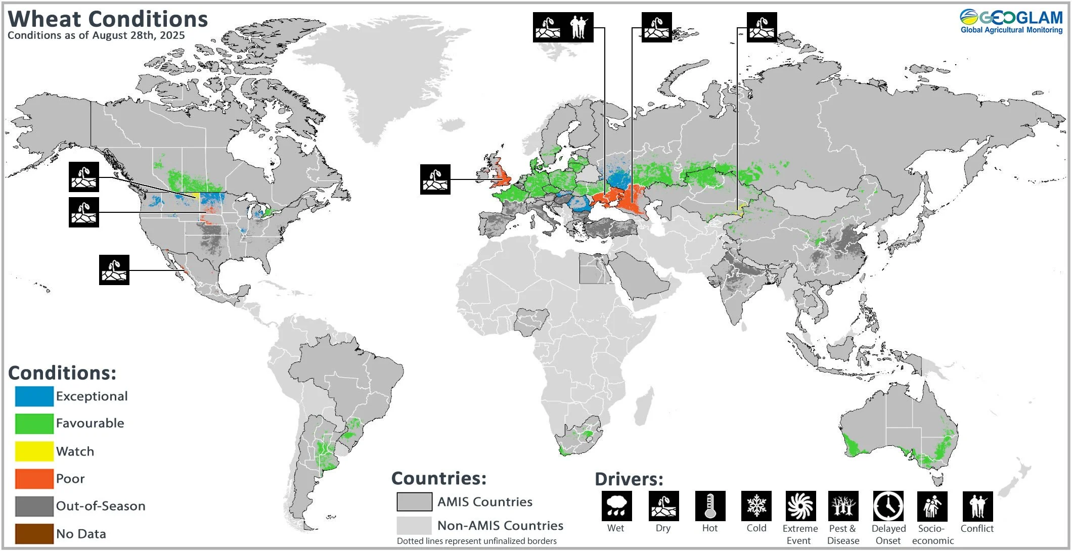 Wheat crop conditions over the main growing areas are based on national and regional crop analyst inputs and earth observation data. Crop condition information is based on information as of August 28th. Where crops are in conditions other than favourable, the climatic drivers responsible for those conditions are displayed. Crop Season Specific Maps can be found in Appendix 2.