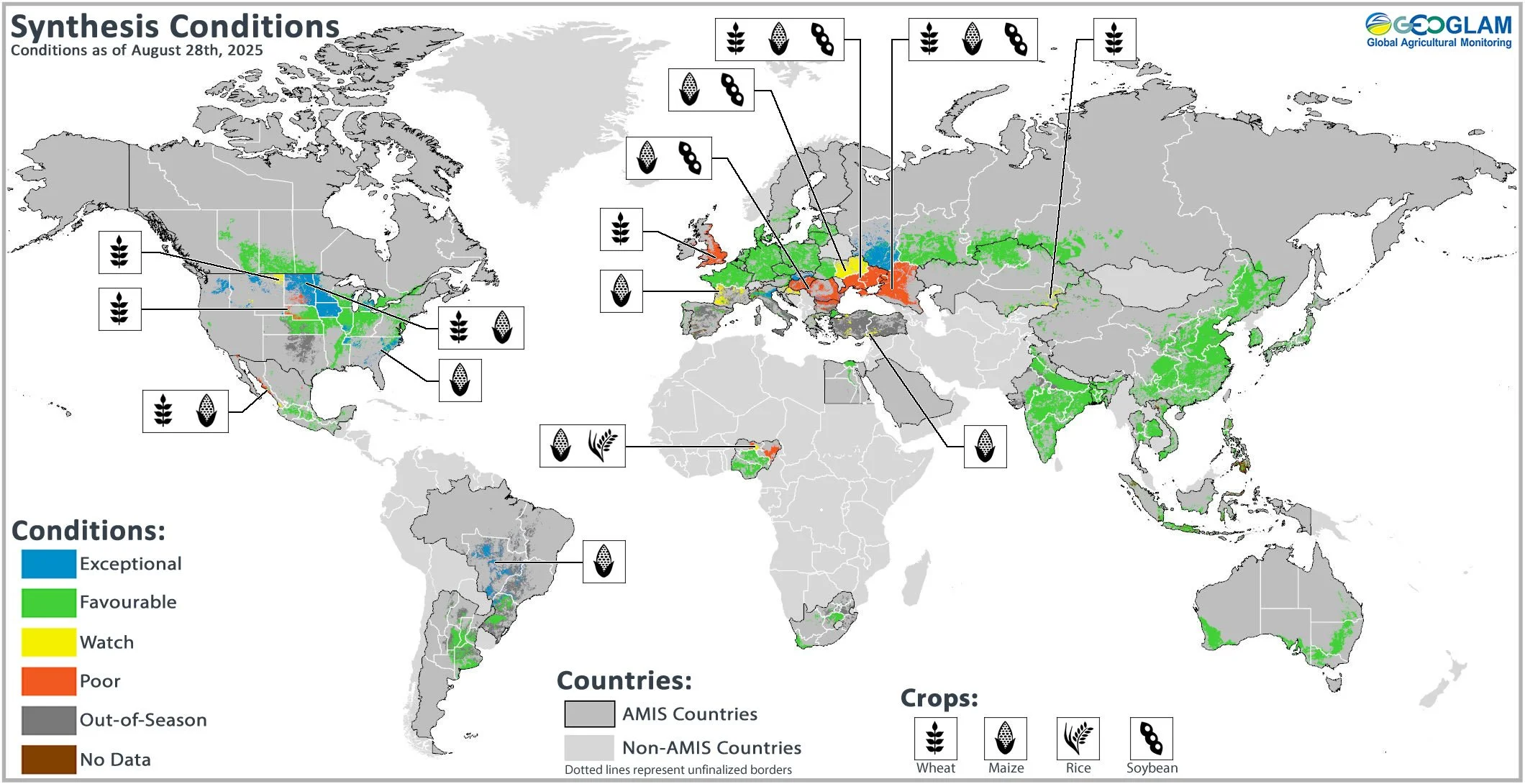 Global crop condition map synthesizing information for all four AMIS crops as of August 28th. Crop conditions over the main growing areas for wheat, maize, rice, and soybean are based on a combination of national and regional crop analyst inputs and earth observation data. Crops that are in conditions other than favourable are displayed on the map with their crop symbol.
