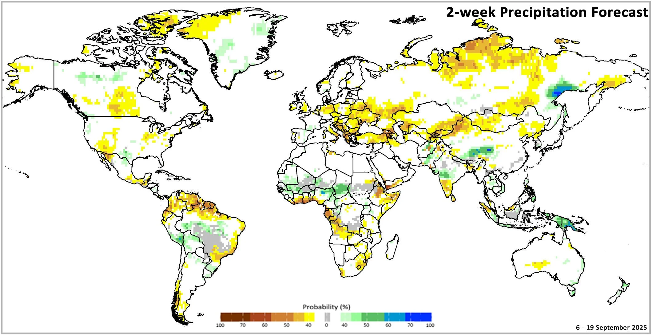 The two-week forecast (Figure 1) shows a chance of above-average precipitation over southern Texas in the US, northeastern Mexico, southern Peru, western and northern Bolivia, central and southern Brazil, southern Mauritania, southern Mali, northeastern Guinea, northwestern Niger, northeastern Nigeria, central and southern Chad, northern Cameroon, central Afghanistan, central west Pakistan, central India, central China, northeastern Russia, the southern Philippines, southern and western Indonesia, Papua New Guinea, and northern New Zealand.