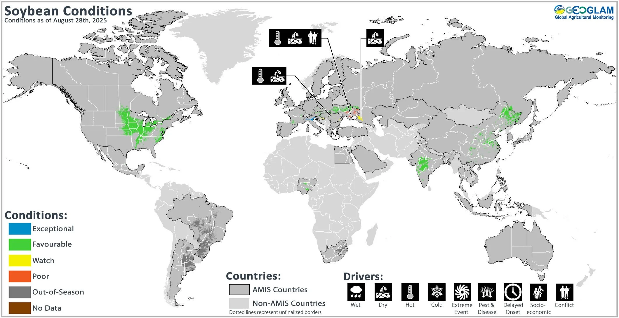 Soybean crop conditions over the main growing areas are based on national and regional crop analyst inputs and earth observation data. Crop condition information is based on information as of August 28th. Where crops are in conditions other than favourable, the climatic drivers responsible for those conditions are displayed. Crop Season Specific Maps can be found in Appendix 2.