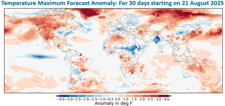 Maximum temperature forecast anomaly for the next 30 days starting on 21 August 2025. Subseasonal Consortium (SubC) model data accessed from the IRI Data Library. Map source: UCSB Climate Hazards Center.