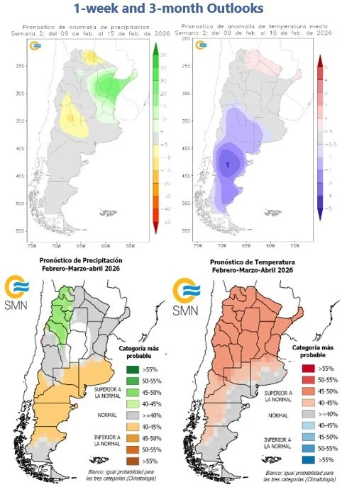 Upper Left: 9 – 15 February precipitation forecast anomaly. Upper Right: 9 – 15 February temperature forecast anomaly. Bottom Left: February-March-April 2026 precipitation forecast. Bottom Right: February-March-April 2026 temperature forecast. Images from the National Meteorological Service of Argentina.