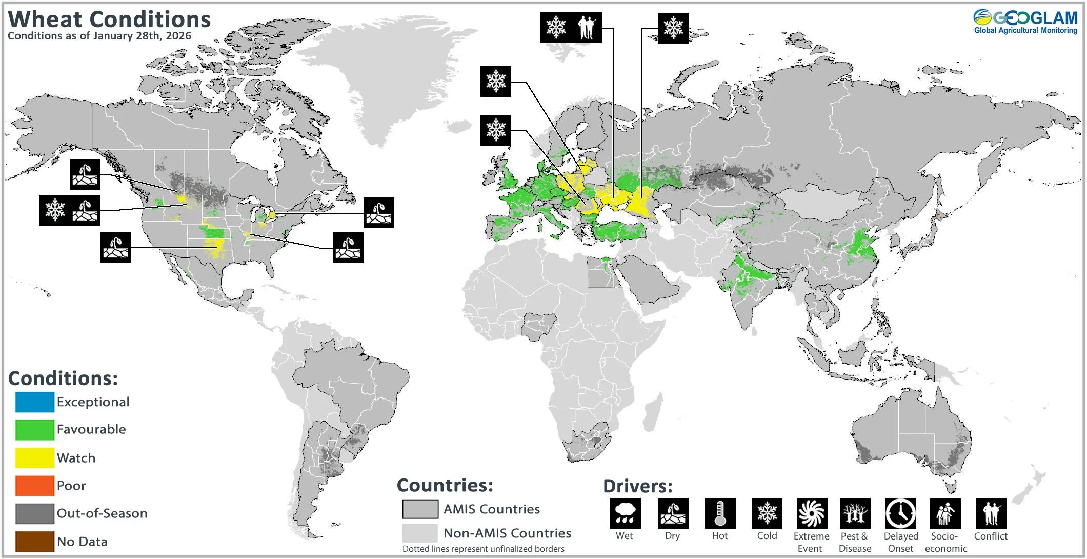 Wheat crop conditions over the main growing areas are based on national and regional crop analyst inputs and earth observation data. Crop condition information is based on information as of January 28th. Where crops are in conditions other than favourable, the climatic drivers responsible for those conditions are displayed. Crop Season Specific Maps can be found in Appendix 2.