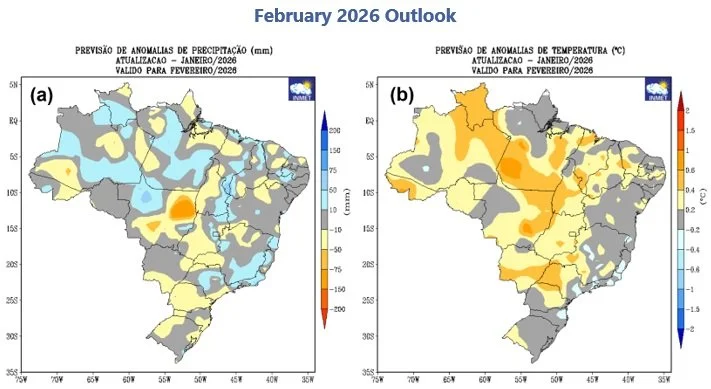 The February 2026 outlook indicates areas of above-average precipitation over the north and southeast of the country, while areas of below-average precipitation over the central west and south regions, particularly over eastern and southern Mato Grosso. During the same time, temperatures are likely to be above-average across most of the country except for in the south and southeast regions.