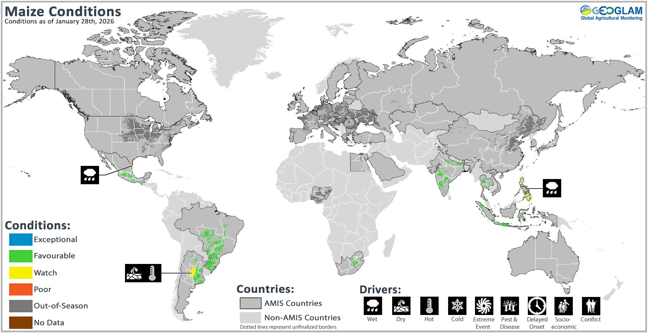 Maize crop conditions over the main growing areas are based on national and regional crop analyst inputs and earth observation data. Crop condition information is based on information as of January 28th. Where crops are in conditions other than favourable, the climatic drivers responsible for those conditions are displayed. Crop Season Specific Maps can be found in Appendix 2.