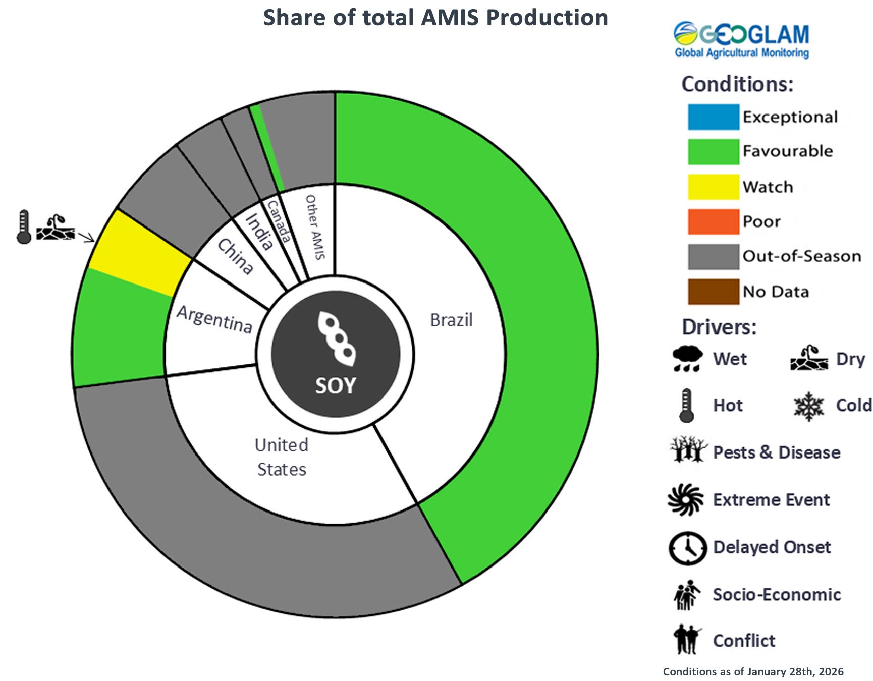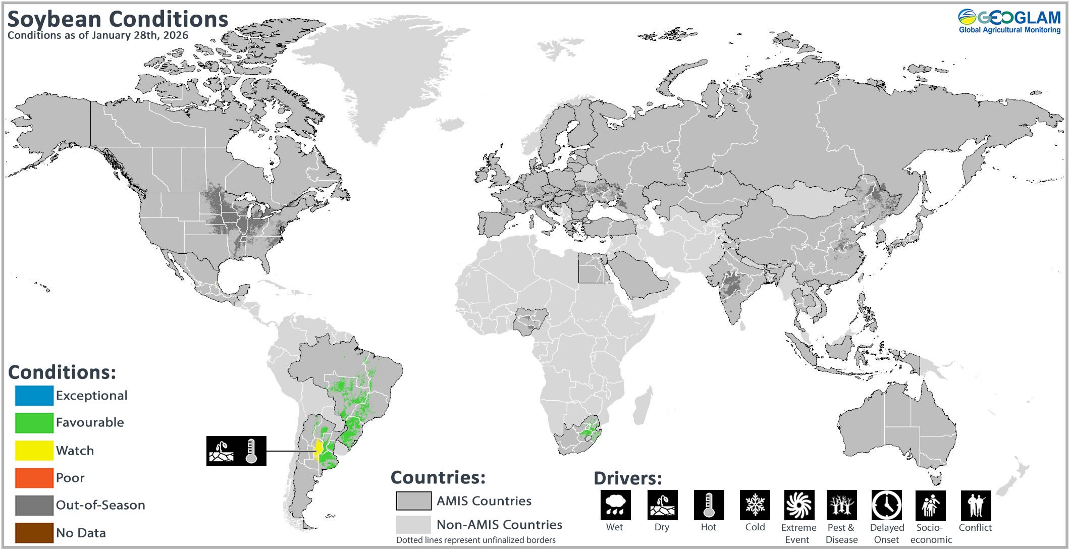 Soybean crop conditions over the main growing areas are based on national and regional crop analyst inputs and earth observation data. Crop condition information is based on information as of January 28th. Where crops are in conditions other than favourable, the climatic drivers responsible for those conditions are displayed. Crop Season Specific Maps can be found in Appendix 2.
