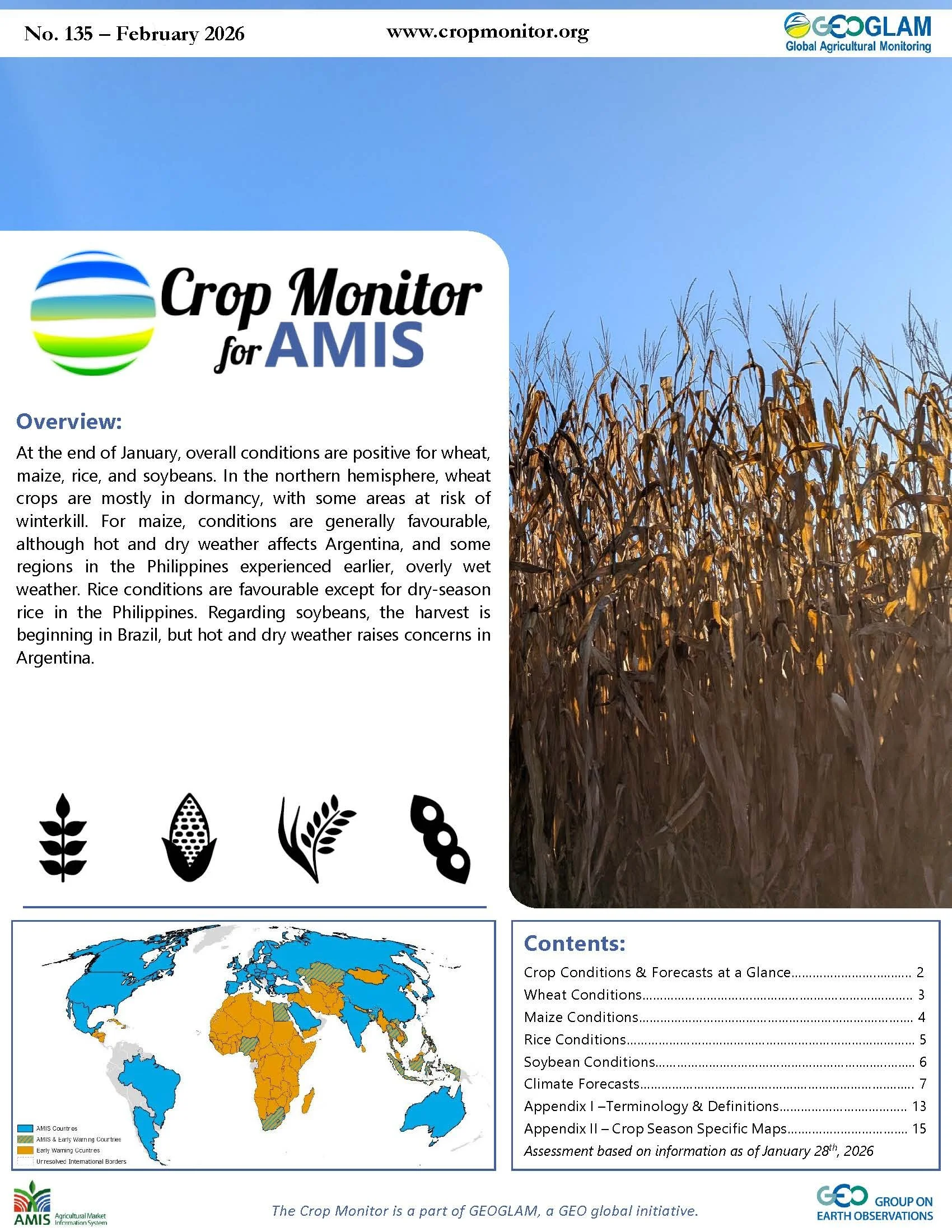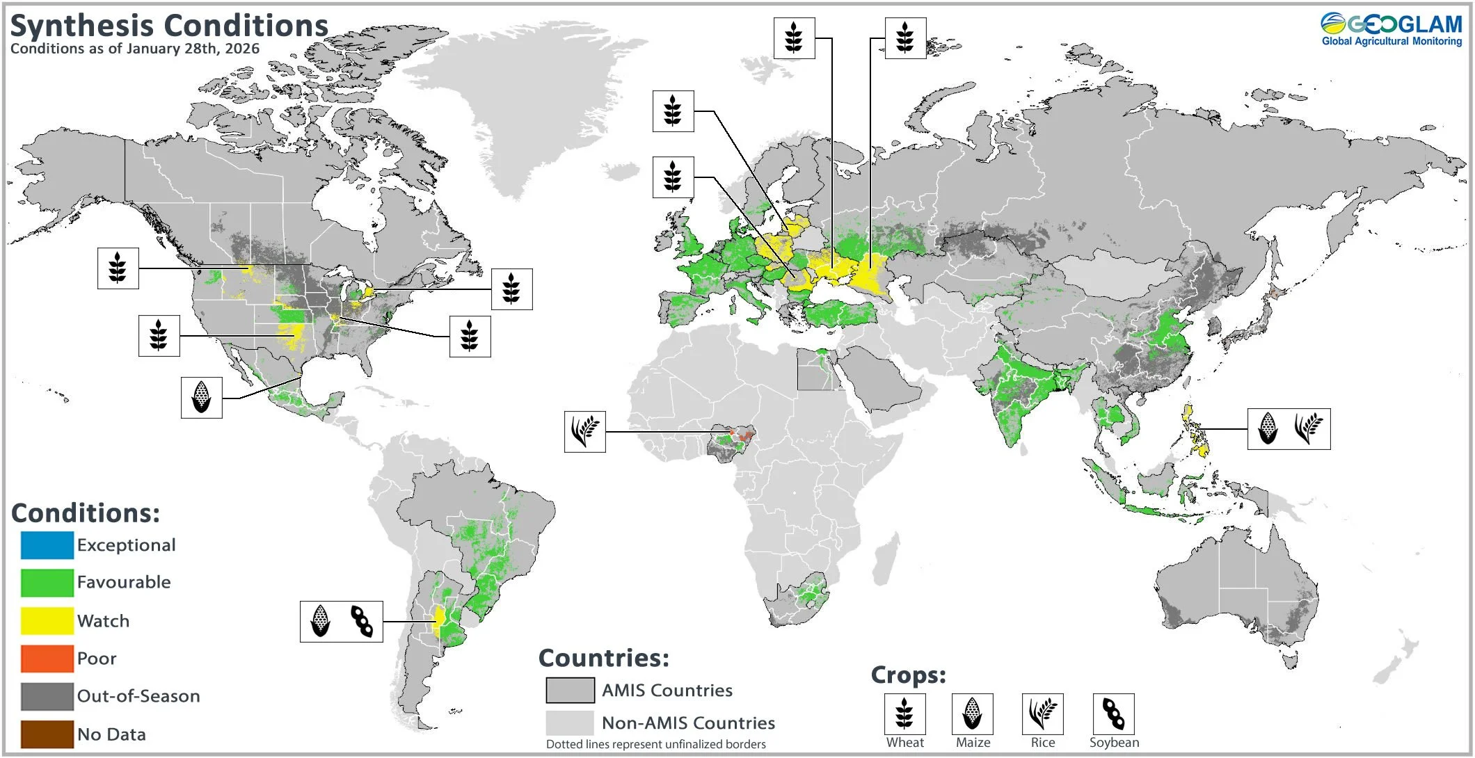 Global crop condition map synthesizing information for all four AMIS crops as of January 28th. Crop conditions over the main growing areas for wheat, maize, rice, and soybean are based on a combination of national and regional crop analyst inputs and earth observation data. Crops that are in conditions other than favourable are displayed on the map with their crop symbol.