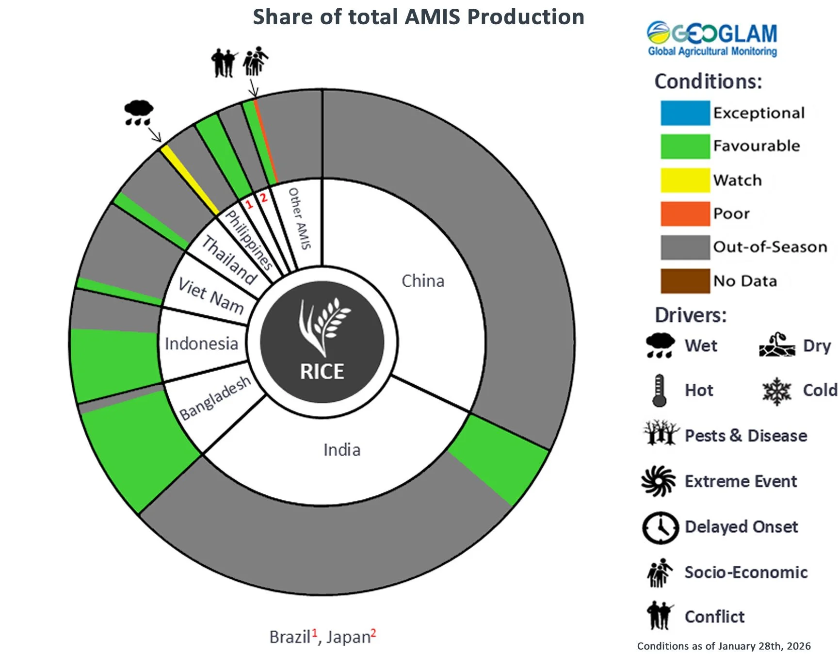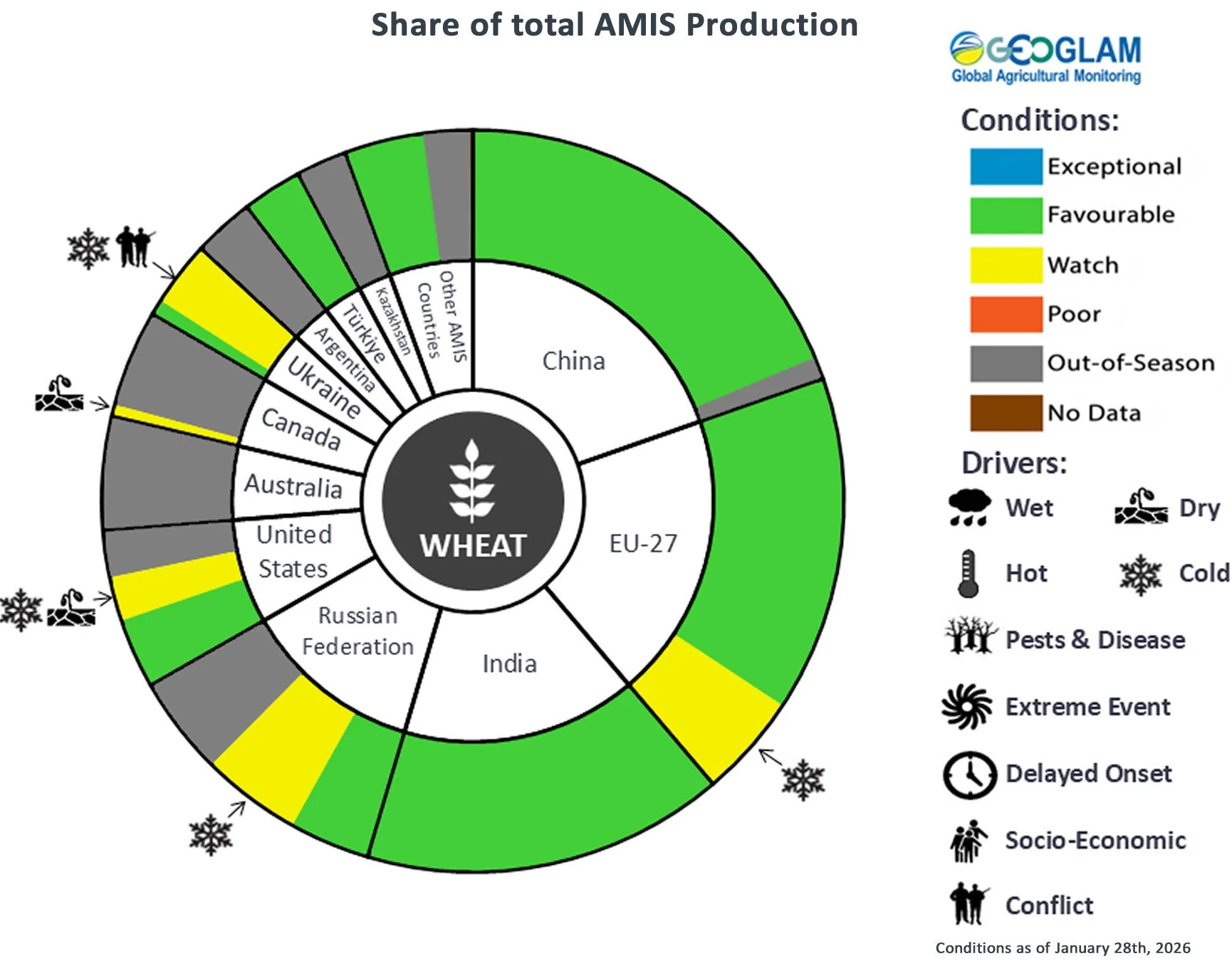 Pie chart description: Each slice represents a country's share of total AMIS production (5-year average). Main producing countries (representing 95 percent of production) are shown individually, with the remaining 5 percent grouped into the “Other AMIS Countries” category. The proportion within each national slice is coloured according to the crop conditions within a specific growing area; grey indicates that the respective area is out of season. Sections within each slice are weighted by the sub-national production statistics (5-year average) of the respective country. The section within each national slice also accounts for multiple cropping seasons (i.e., spring and winter wheat). When conditions are other than’ favourable’, icons are added that provide information on the key climatic drivers affecting conditions.