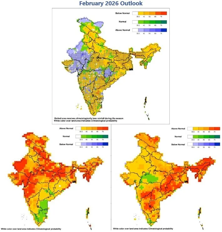 Top: Probability forecast of tercile categories* (below normal, normal, and above normal) for the rainfall during February 2026. Bottom Left: Probability forecast of Minimum Temperature for February 2026. Bottom Right: Probability forecast of Maximum Temperature for February 2026. Maps from the India Meteorological Department.