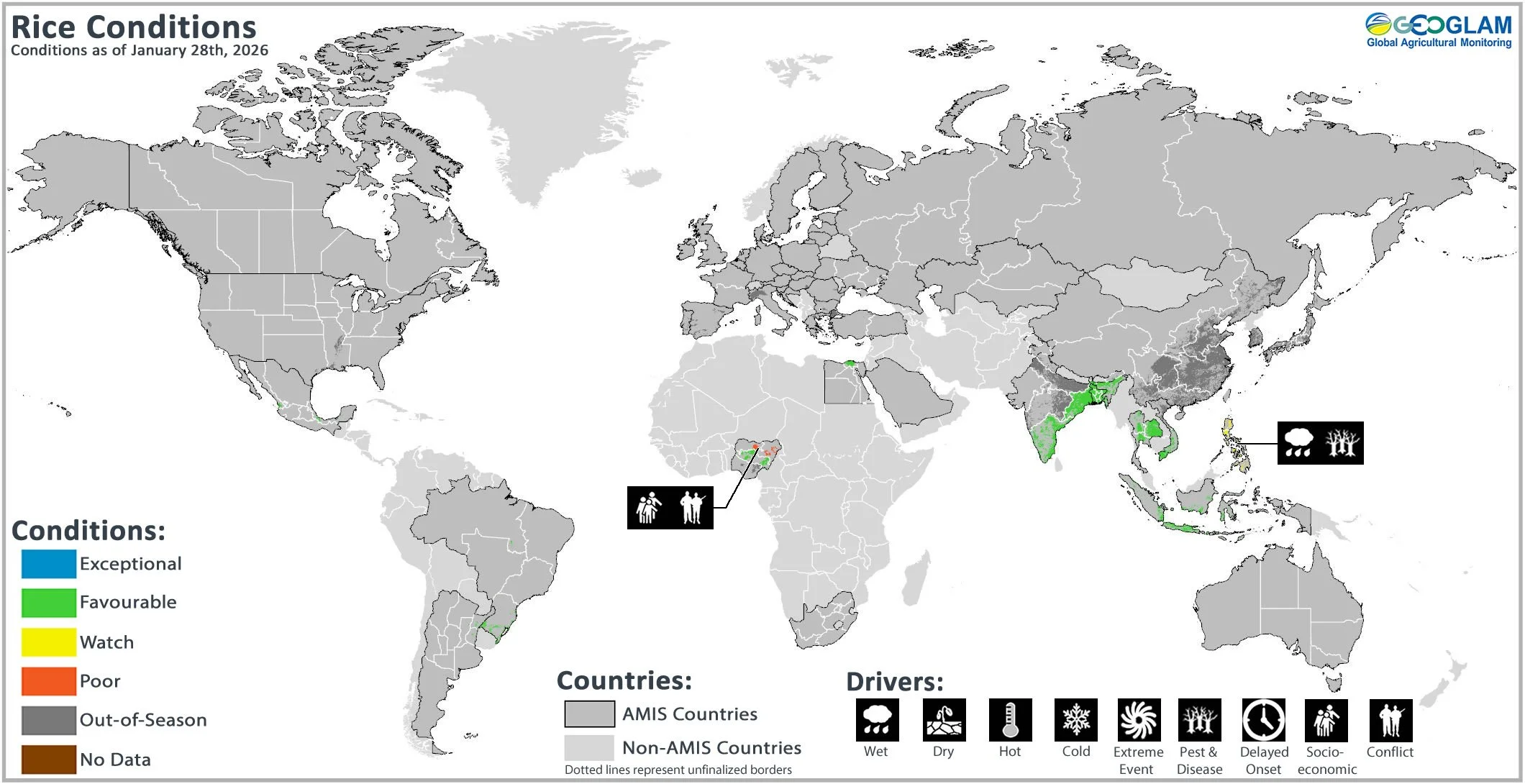 Rice crop conditions over the main growing areas are based on national and regional crop analyst inputs and earth observation data. Crop condition information is based on information as of January 28th. Where crops are in conditions other than favourable, the climatic drivers responsible for those conditions are displayed. Crop Season Specific Maps can be found in Appendix 2.