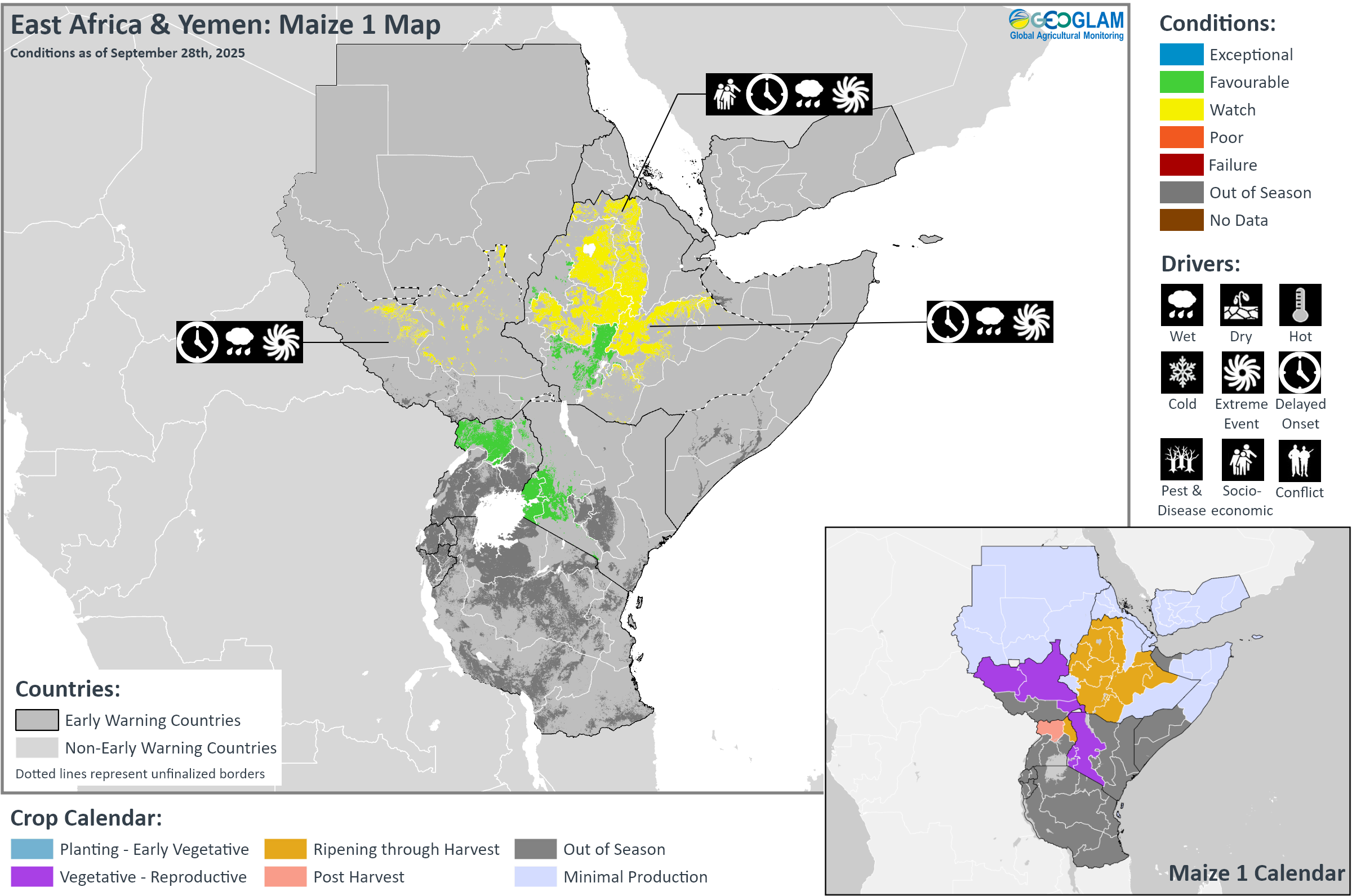 Crop condition map synthesizing Maize 2 conditions as of September 28th. Crop conditions over the main growing areas are based on a combination of inputs including remotely sensed data, ground observations, field reports, national, and regional experts. Conditions that are other than favourable are labeled on the map with their driver.