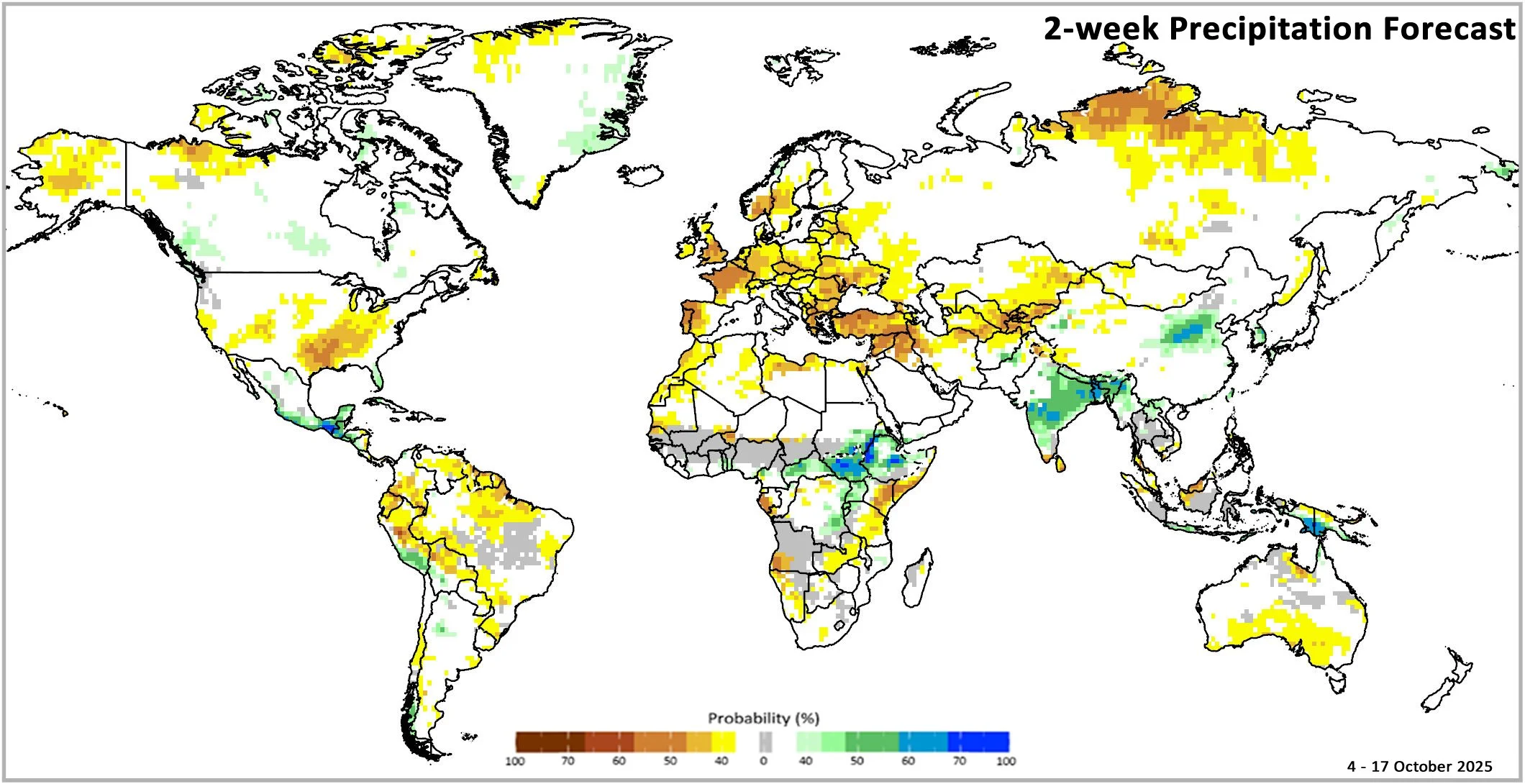 Figure 1: IRI SubX Precipitation Biweekly Probability Forecast for 4 – 17 October 2025, issued on 26 September 2025. The forecast is based on statistically calibrated tercile category forecasts from three SubX models. Source: IRI Subseasonal Forecasts Maproom