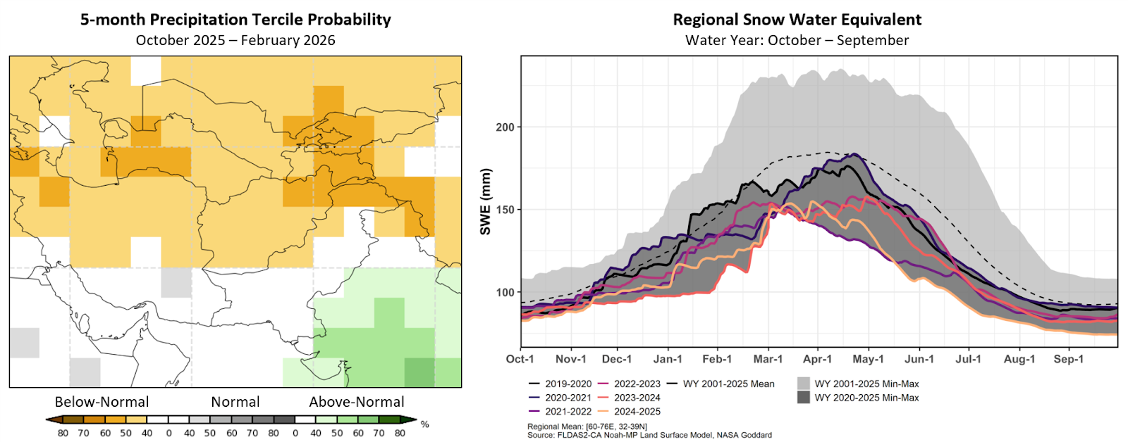 Left: Probabilistic forecast for October 2025 to February 2026 precipitation, based on September initial conditions. From the WMO Lead Centre Long-Range Forecast Multi-Model Ensemble. Right: Regional average cumulative Snow Water Equivalent (SWE), shown for October 2024 to September 2025, and the previous five years. Shaded areas and the dotted line show the historical mean and lowest and highest values between 2001 and 2025. The darker shaded areas and solid black line show the same but for 2019/2020 to 2024/2025. From NASA, using SWE estimates from the FLDAS Central Asia model.