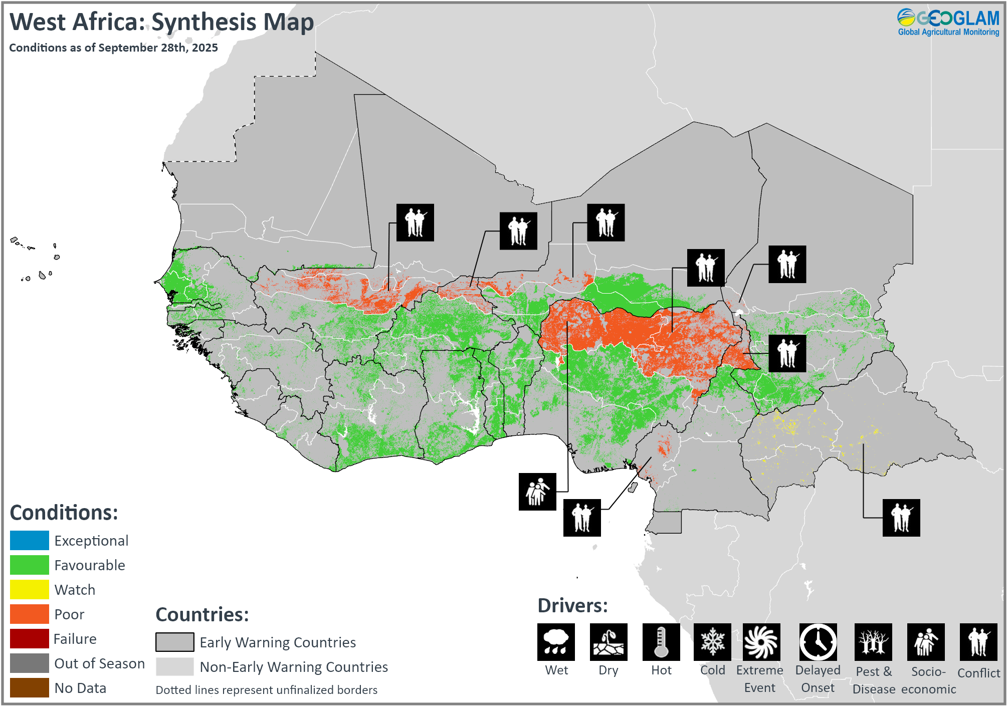 Crop condition map synthesizing Sorghum 1 conditions as of September 28th. Crop conditions over the main growing areas are based on a combination of inputs including remotely sensed data, ground observations, field reports, national, and regional experts. Conditions that are other than favourable are labeled on the map with their driver.