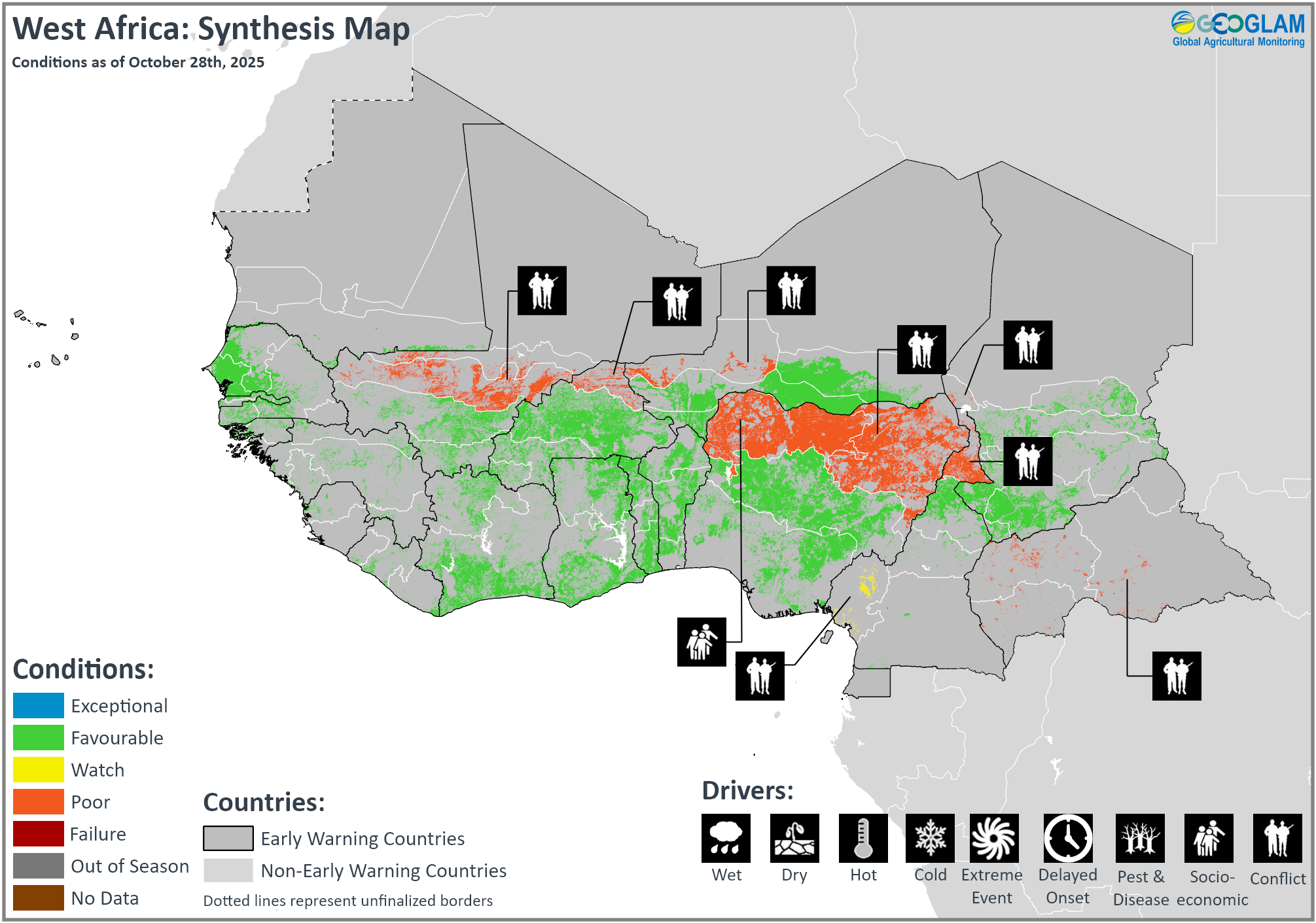 In West Africa, harvesting of main season cereals is nearing completion with generally favourable outcomes expected, except in conflict-affected regions.