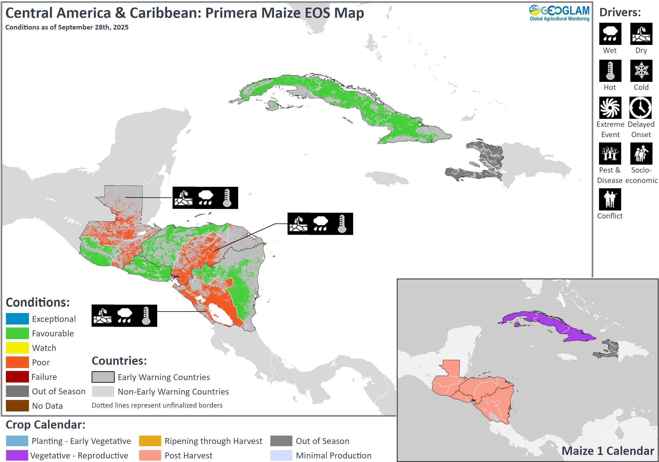 Crop condition map synthesizing Maize 1 crop conditions as of September 28th. Crop conditions over the main growing areas are based on a combination of inputs including remotely sensed data, ground observations, field reports, national, and regional experts. Conditions that are other than favourable are labeled on the map with their driver.