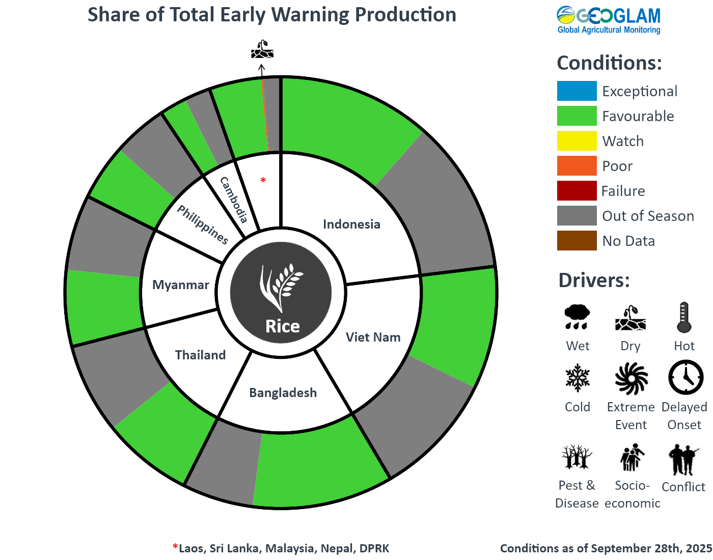 Crop condition map synthesizing rice conditions as of September 28th. Crop conditions over the main growing areas are based on a combination of inputs including remotely sensed data, ground observations, field reports, national, and regional experts. Crops that are in other than favourable conditions are labeled on the map with their driver.