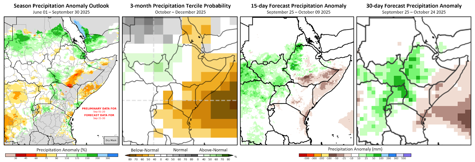 In eastern East Africa, there are concerns for a drier-than-average October to December (OND) 2025 season. The CHIRPS-GEFS, SubC and ECMWF forecasts indicate below-average rains during late September to early-late October (Figure 1 middle-right and right). In southeastern Ethiopia and Somalia, short rains/Deyr season rains typically peak in October. The season is typically short and a delayed onset is likely to impact crop yields and pasture development.