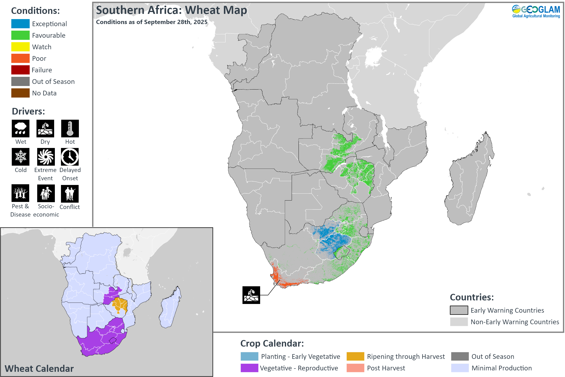 Crop condition map synthesizing wheat conditions as of September 28th. Crop conditions over the main growing areas are based on a combination of inputs including remotely sensed data, ground observations, field reports, national, and regional experts. Crops that are in other than favourable conditions are labeled on the map with their driver.
