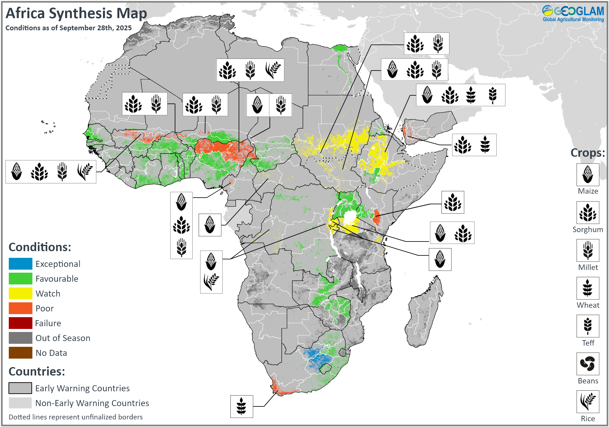 Crop condition map synthesizing information for all Crop Monitor for Early Warning crops as of September 28th. Crop conditions over the main growing areas are based on a combination of inputs including remotely sensed data, ground observations, field reports, national, and regional experts. Regions that are in other than favourable conditions are labeled on the map with a symbol representing the crop(s) affected.