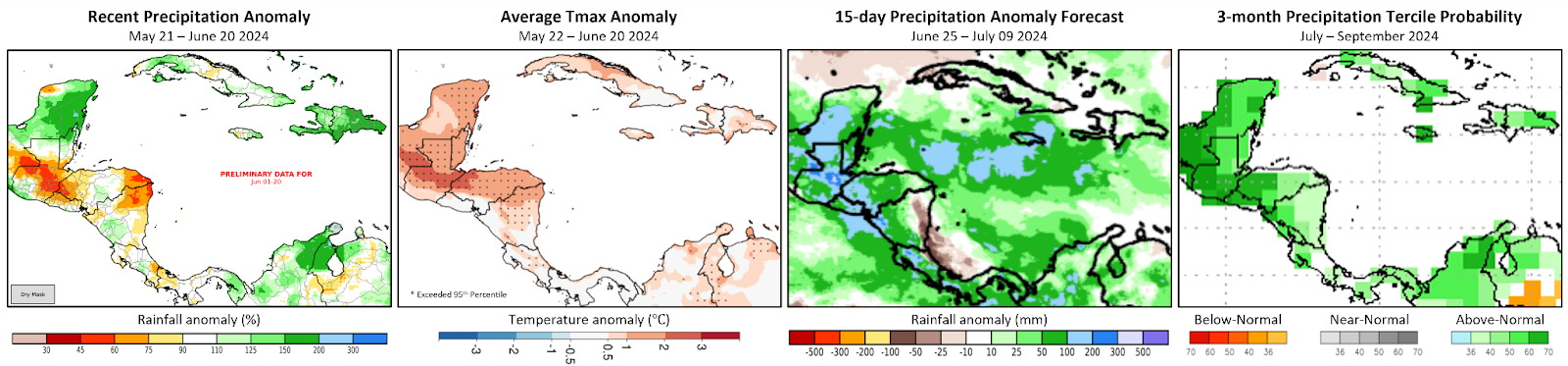 In Central America, harvesting of Primera season cereals is now underway in Guatemala while crops continue to develop in El Salvador, Honduras, and Nicaragua for harvest from August. A one-month delay in the start of seasonal rains was followed by a shift to torrential precipitation, which improved deficits and resulted in crop recovery in many areas but also caused subsequent flooding and landslides in parts of Guatemala and El Salvador since June. In El Salvador, the country declared a national state of emergency on June 16 due to the severe weather-related incidents. While the rains have been generally conducive to maize development, except in east and northern Guatemala, the excess soil moisture is causing concern for bean crops as they are very sensitive to moisture conditions. Throughout the region, subsistence farmers began to plant their fields in conjunction with the timing of the rainfall onset. However, many lost their seeds with the shift to heavy rains, which affected the typical sowing time and resulted in a planting delay. Many areas have not been sown yet, particularly for beans, as farmers are determining if it is a worthwhile option due to the severe weather incidents and high soil moisture levels. Above-average rains are expected to continue across El Salvador, Guatemala, Honduras, and Nicaragua through early August, followed by a likely continuation of above-average rains in all areas through October (See Regional Outlook Pg. 16). Additionally, the June to November 2024 Atlantic hurricane season is expected to produce an above-average number of storms. Hurricane Beryl was the strongest to form in June in the Atlantic Ocean and the earliest Category 4 storm on record.
