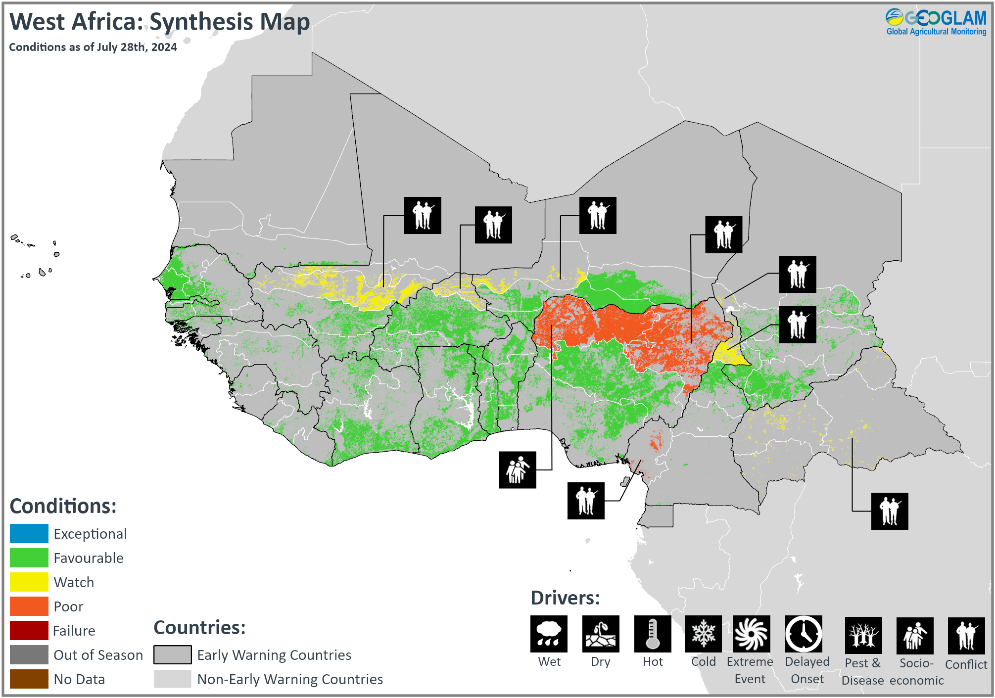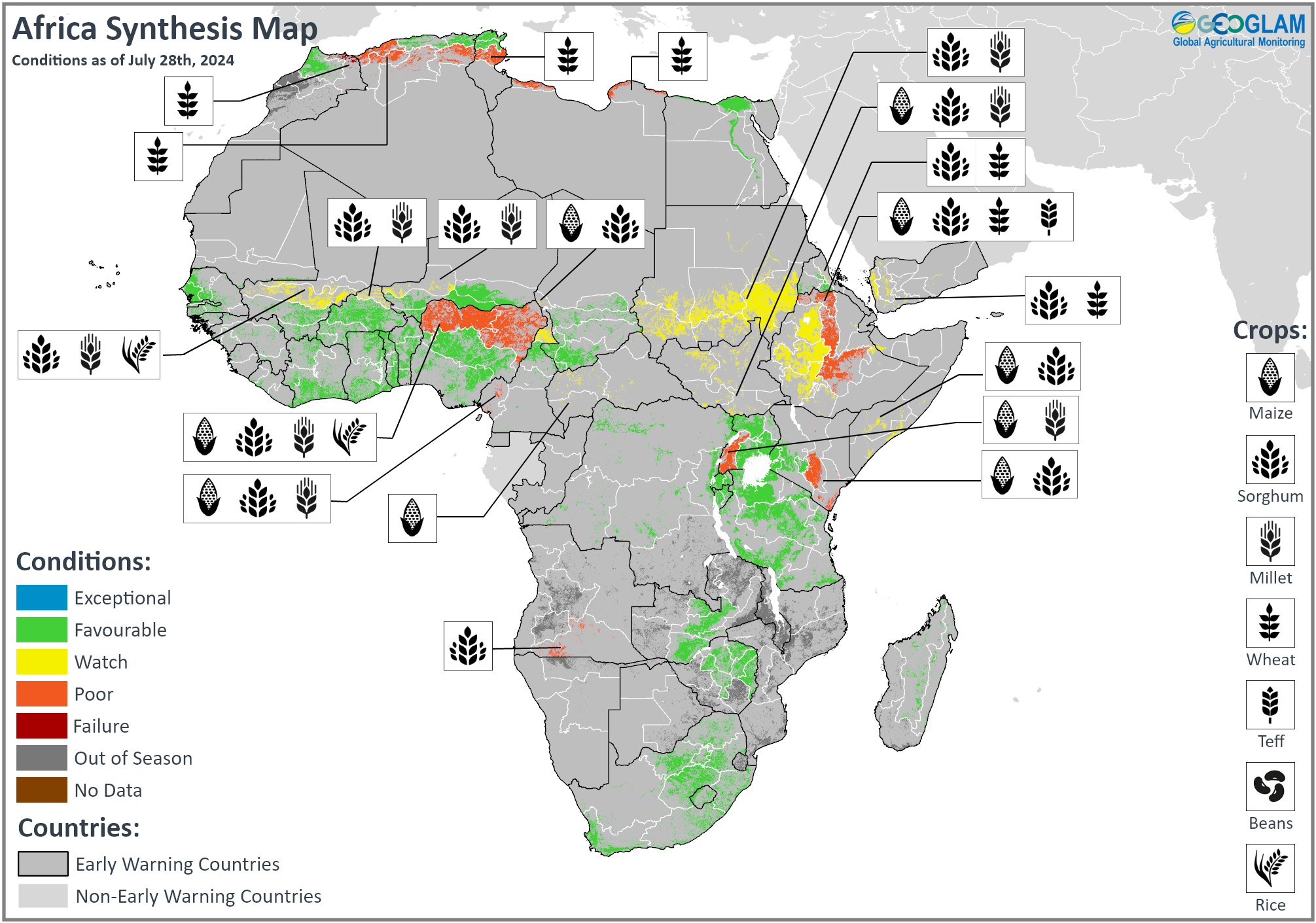 Crop condition map synthesizing crop conditions as of July 28th. Crop conditions over the main growing areas are based on a combination of inputs including remotely sensed data, ground observations, field reports, national, and regional experts. Crops that are in other than favourable conditions are labeled on the map with their driver.