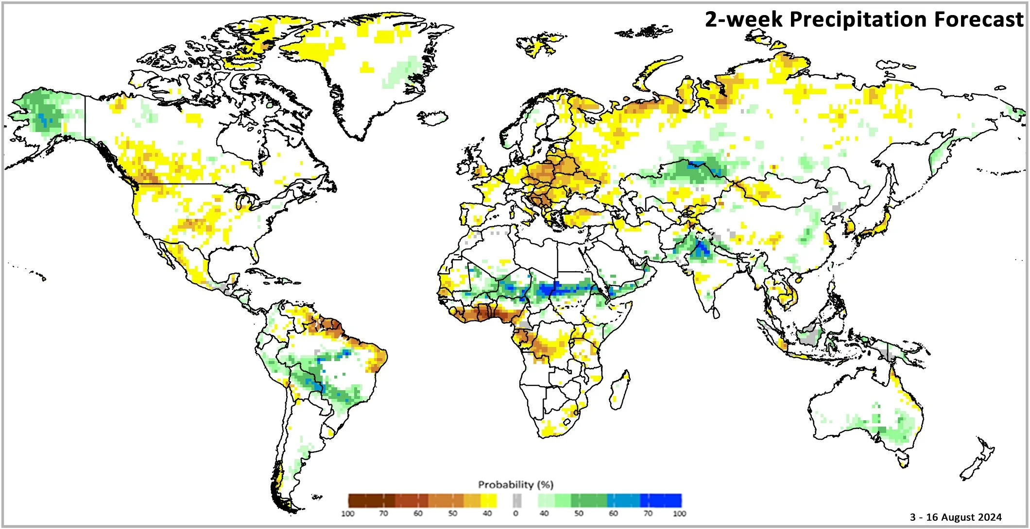 The two-week forecast (Figure 1) indicates a likelihood of above-average precipitation over Alaska in the US, central Peru, northern and eastern Bolivia, central and southeast Brazil, Mali, Niger, Chad, Sudan, Eritrea, northern Ethiopia, southern Somalia, Yemen, eastern and western Oman, northern Kazakhstan, Siberia in the Russian Federation, south-central Afghanistan, Pakistan, northeast India, central China, and southern and eastern Australia.