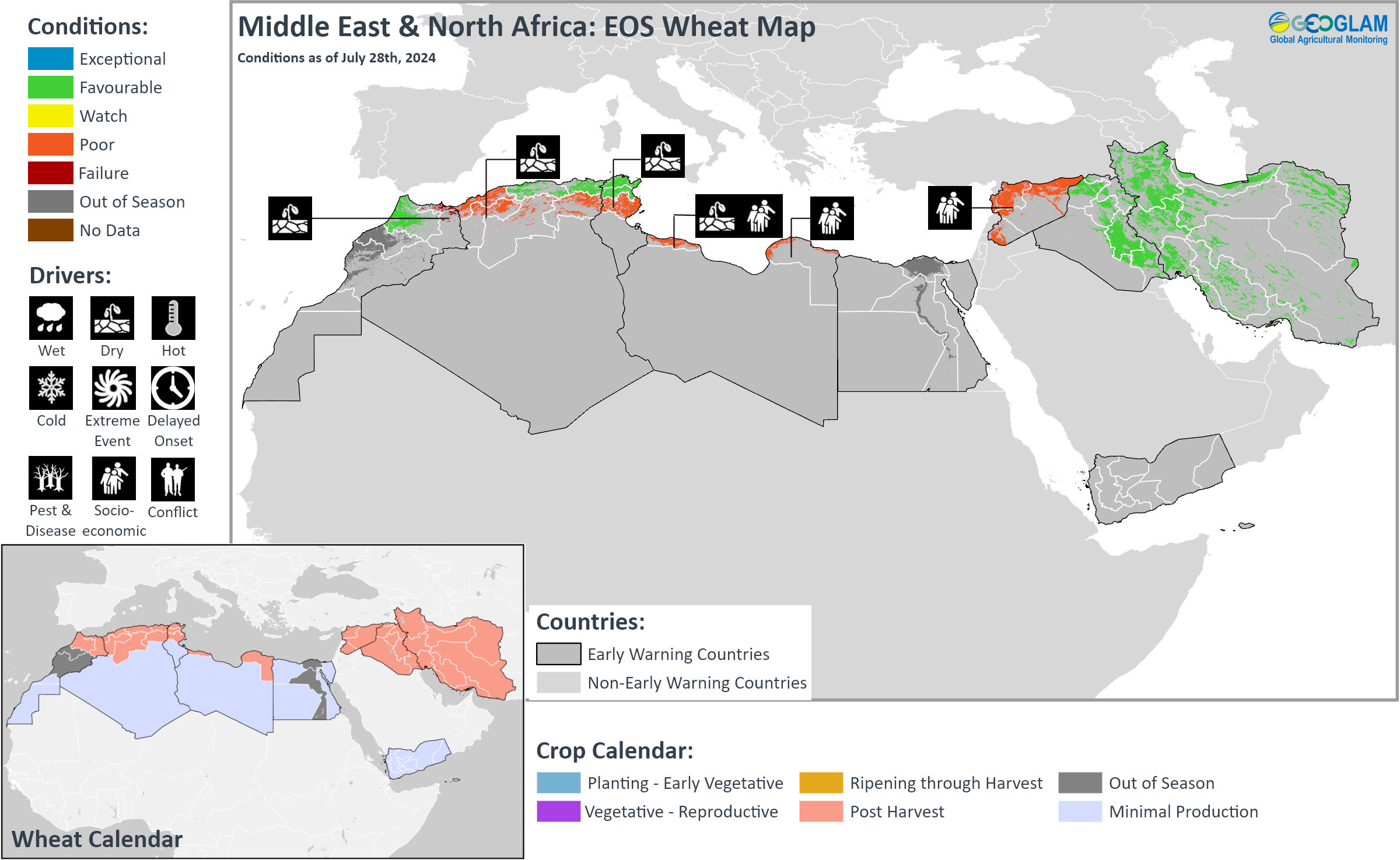 MIDDLE EAST & NORTH AFRICA: Wheat harvesting finalized in July under mixed conditions, with generally poor to failure outcomes in western North Africa due to prolonged drought and high temperatures and generally favourable outcomes elsewhere. In Libya and Syria, socio-economic challenges relating to protracted conflict continue to constrain agricultural outcomes.