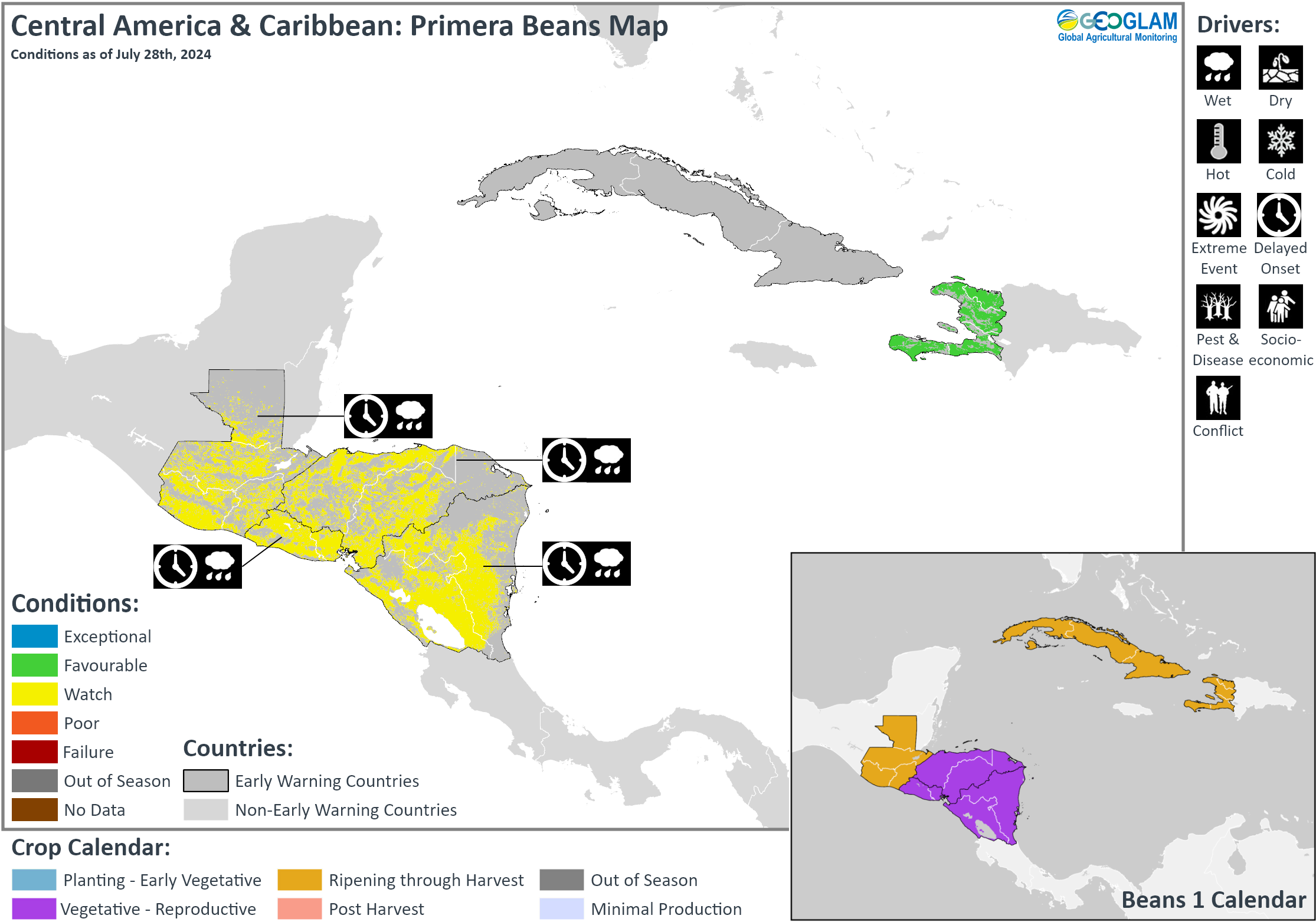 Crop condition map synthesizing Primera season bean conditions as of July 28th. Crop conditions over the main growing areas are based on a combination of inputs including remotely sensed data, ground observations, field reports, national, and regional experts. Conditions that are other than favourable are labeled on the map with their driver.