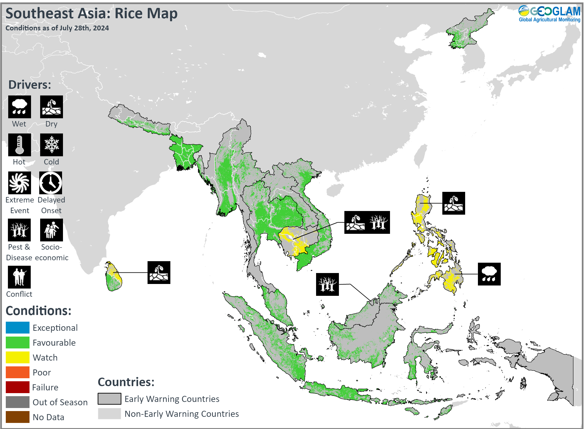 Crop condition map synthesizing rice conditions as of July 28th. Crop conditions over the main growing areas are based on a combination of inputs including remotely sensed data, ground observations, field reports, national, and regional experts. Crops that are in other than favourable conditions are labeled on the map with their driver.