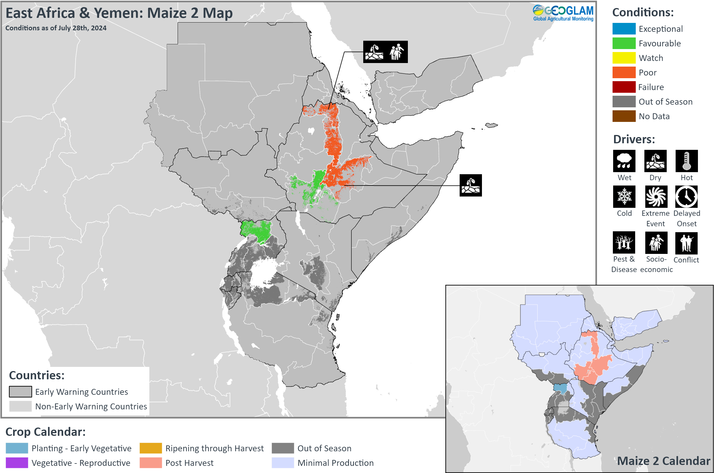 Crop condition map synthesizing Maize 2 conditions as of July 28th. Crop conditions over the main growing areas are based on a combination of inputs including remotely sensed data, ground observations, field reports, national, and regional experts. Conditions that are other than favourable are labeled on the map with their driver.