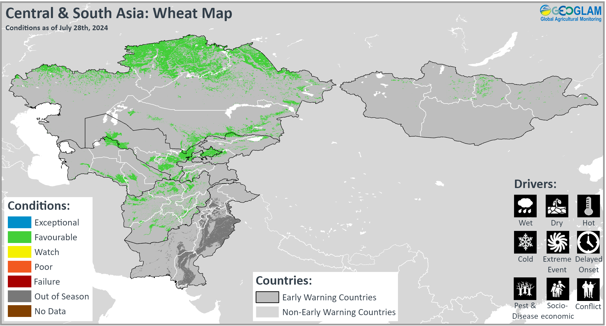 Crop condition map synthesizing wheat conditions as of July 28th. Crop conditions over the main growing areas are based on a combination of inputs including remotely sensed data, ground observations, field reports, national, and regional experts. Crops that are in other than favourable conditions are labeled on the map with their driver.
