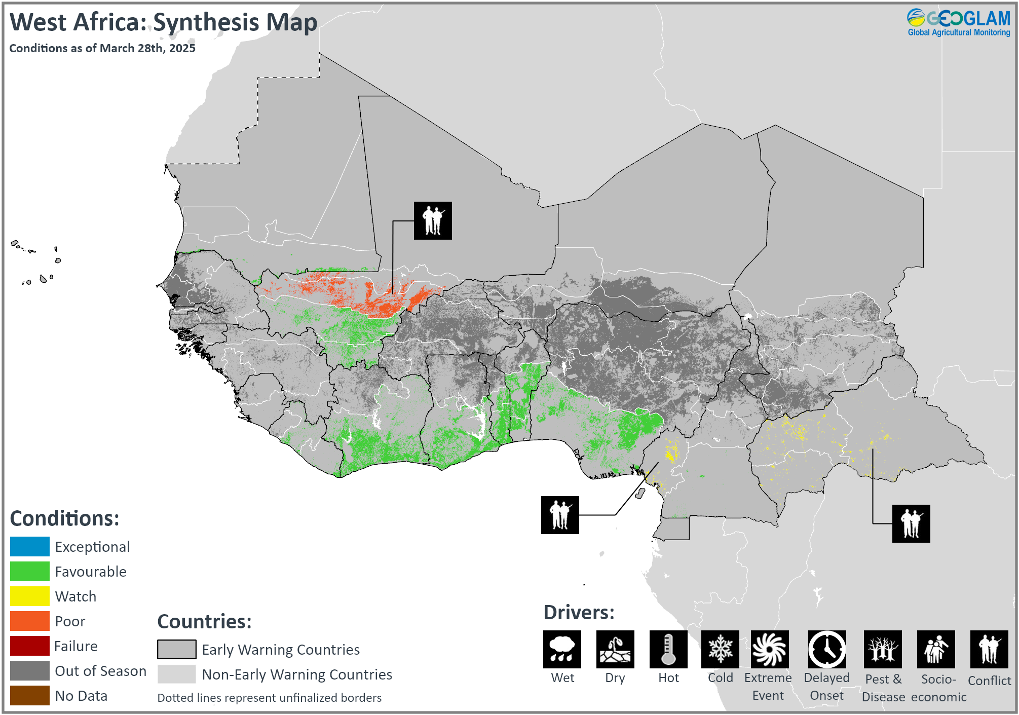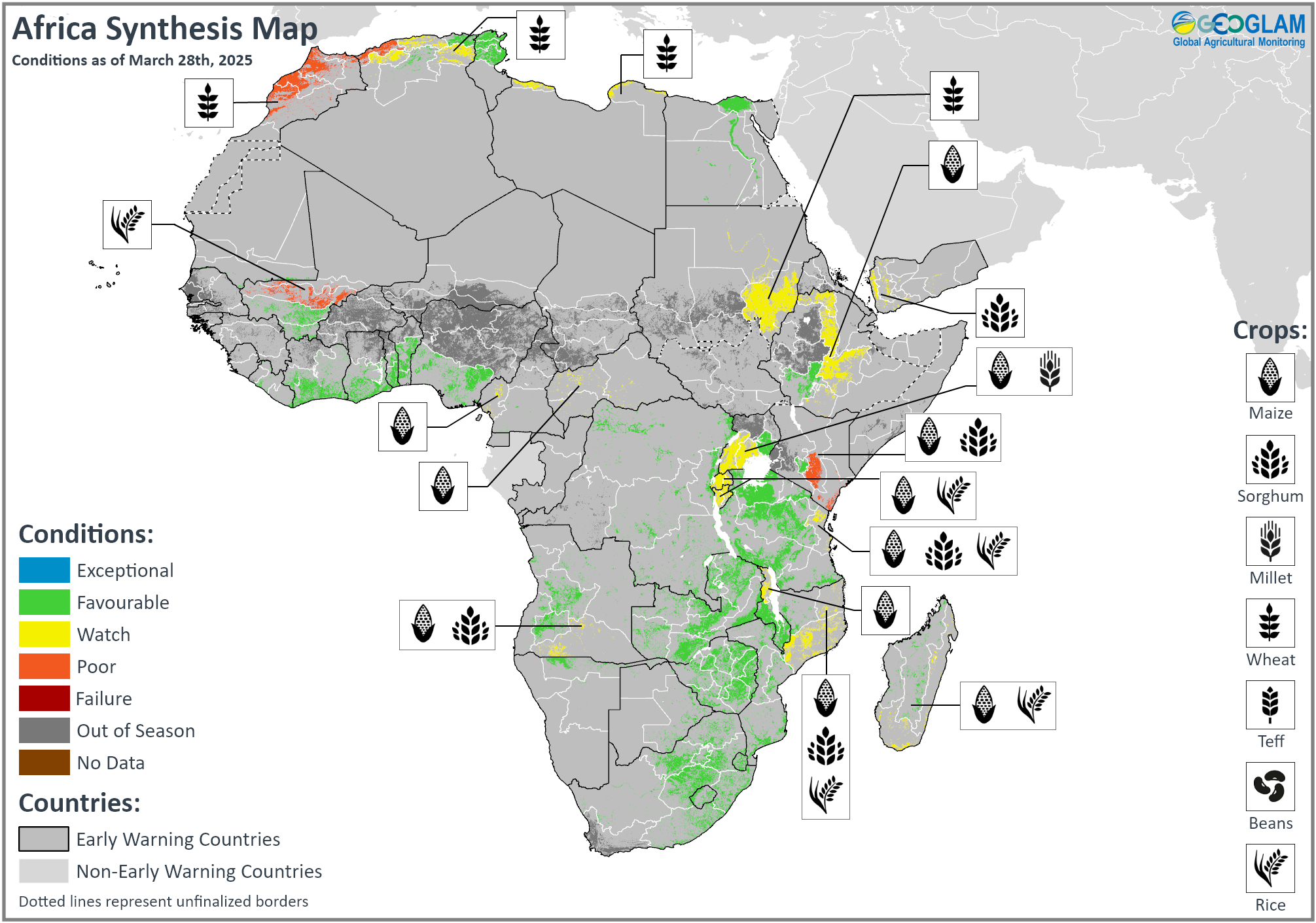 Crop condition map synthesizing information for all Crop Monitor for Early Warning crops as of March 28th. Crop conditions over the main growing areas are based on a combination of i4puts including remotely sensed data, ground observations, field reports, national, and regional experts. Regions that are in other than favourable conditions are labeled on the map with a symbol representing the crop(s) affected.