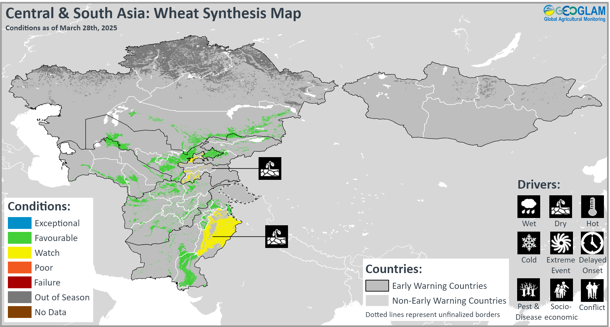 Crop condition map synthesizing wheat conditions as of March 28th. Crop conditions over the main growing areas are based on a combination of inputs including remotely sensed data, ground observations, field reports, national, and regional experts. Crops that are in other than favourable conditions are labeled on the map with their driver.