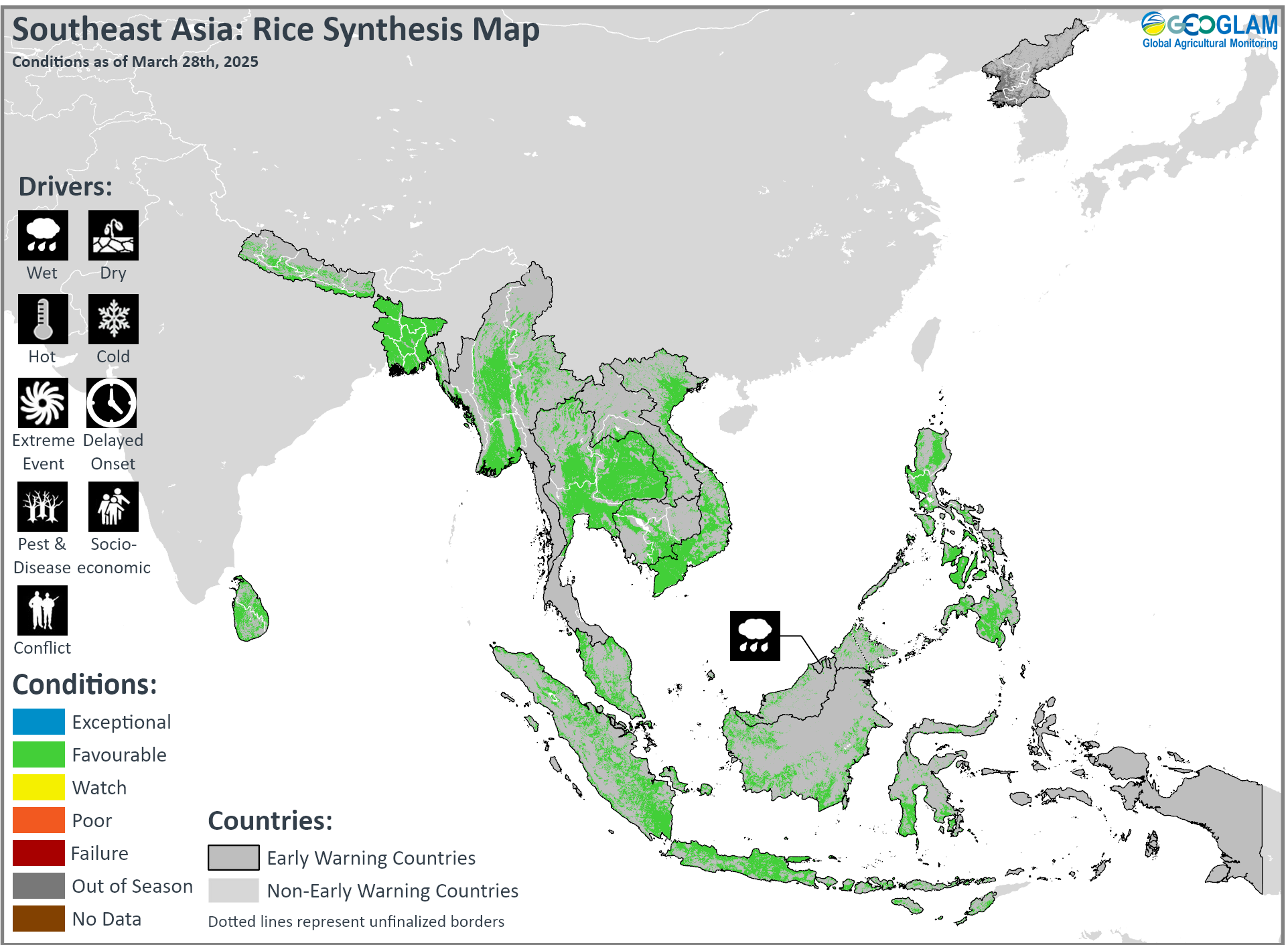 Crop condition map synthesizing rice conditions as of March 28th. Crop conditions over the main growing areas are based on a combination of inputs including remotely sensed data, ground observations, field reports, national, and regional experts. Crops that are in other than favourable conditions are labeled on the map with their driver.