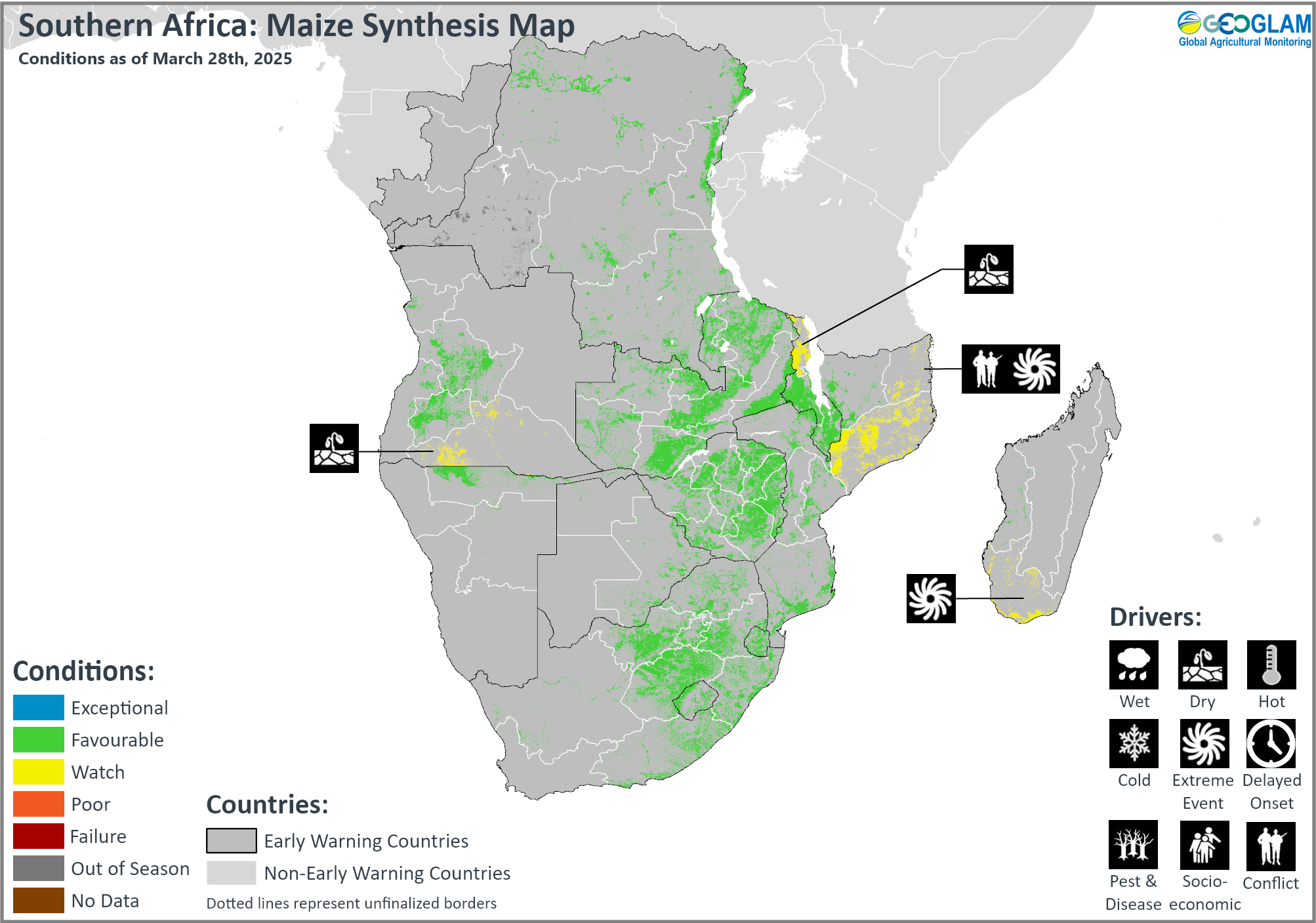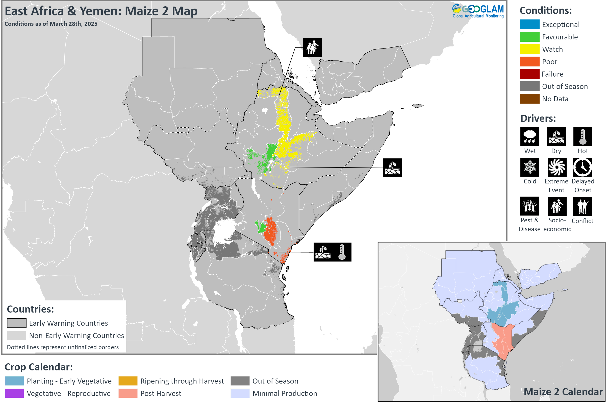 Crop condition map synthesizing Maize 2 conditions as of March 28th. Crop conditions over the main growing areas are based on a combination of inputs including remotely sensed data, ground observations, field reports, national, and regional experts. Conditions that are other than favourable are labeled on the map with their driver.