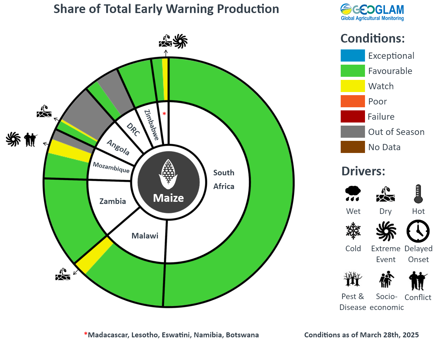 Crop condition map synthesizing maize conditions as of March 28th. Crop conditions over the main growing areas are based on a combination of inputs including remotely sensed data, ground observations, field reports, national, and regional experts. Crops that are in other than favourable conditions are labeled on the map with their driver.