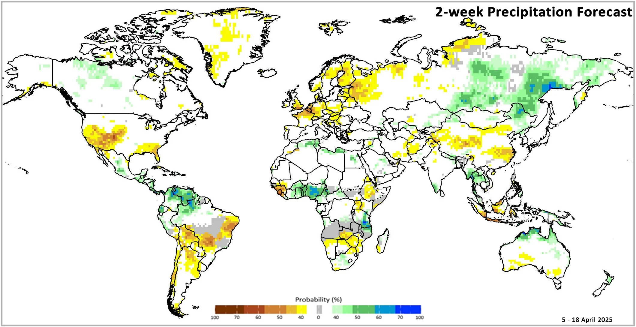 Figure 1: IRI SubX Precipitation Biweekly Probability Forecast for 5 – 18 April 2025, issued on 28 March 2025. The forecast is based on statistically calibrated tercile category forecasts from three SubX models. Source: IRI Subseasonal Forecasts Maproom
