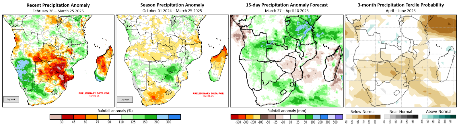 Left and middle-left: Both panels are CHC Early Estimates, which compare current precipitation totals to the 1981/82-2023/24 CHIRPS average for respective accumulation periods. These show the precipitation anomaly (difference from average; [mm]) for February 26th to March 25th, 2025 (left), and for October 1st, 2024, to March 25th, 2025 (middle-left). Both use CHIRPS Prelim for March 1st to 25th. Middle-right: A 15-day CHIRPS-GEFS (unbiased GEFS) forecast from March 27th, 2025 with values indicating how the forecast compares to the CHIRPS average for this period. Right: Probabilistic forecast for April to June 2025 precipitation tercile (March initial conditions), derived from forecasts from seven North American Multi-Model Ensemble (NMME) models. Colors indicate the probability of each category, based on 124 ensemble members and a 1991-2020 baseline. White indicates a high level of disagreement amongst forecasts.