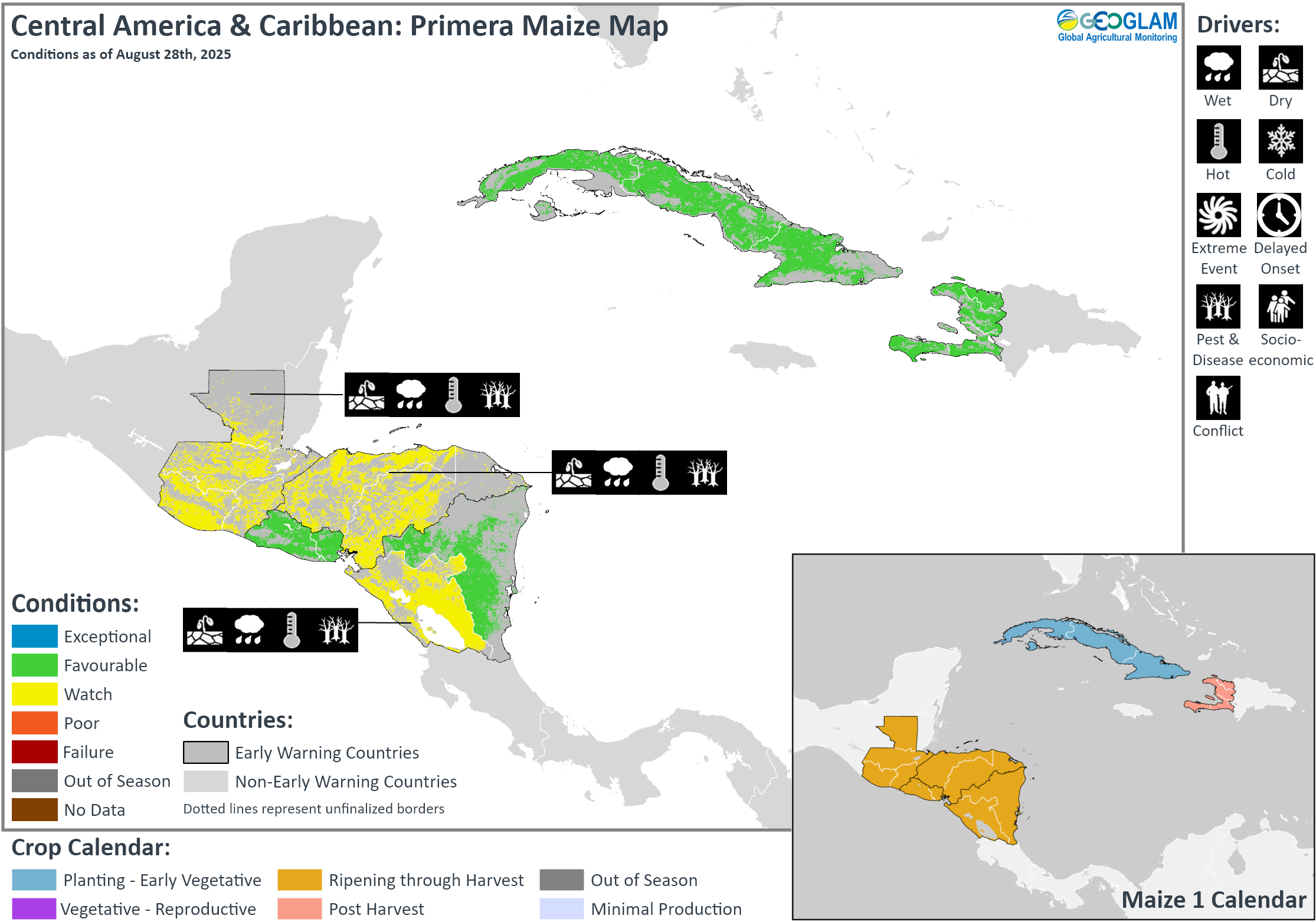 Crop condition map synthesizing Primera season maize conditions as of August 28th. Crop conditions over the main growing areas are based on a combination of inputs including remotely sensed data, ground observations, field reports, national, and regional experts. Conditions that are other than favourable are labeled on the map with their driver.