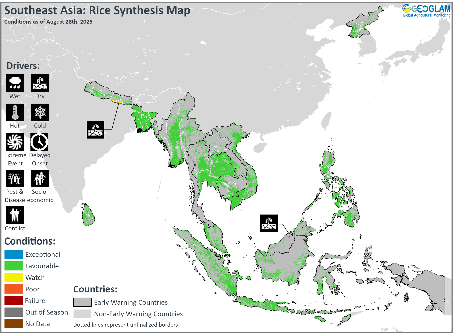 Crop condition map synthesizing rice conditions as of August 28th. Crop conditions over the main growing areas are based on a combination of inputs including remotely sensed data, ground observations, field reports, national, and regional experts. Crops that are in other than favourable conditions are labeled on the map with their driver.