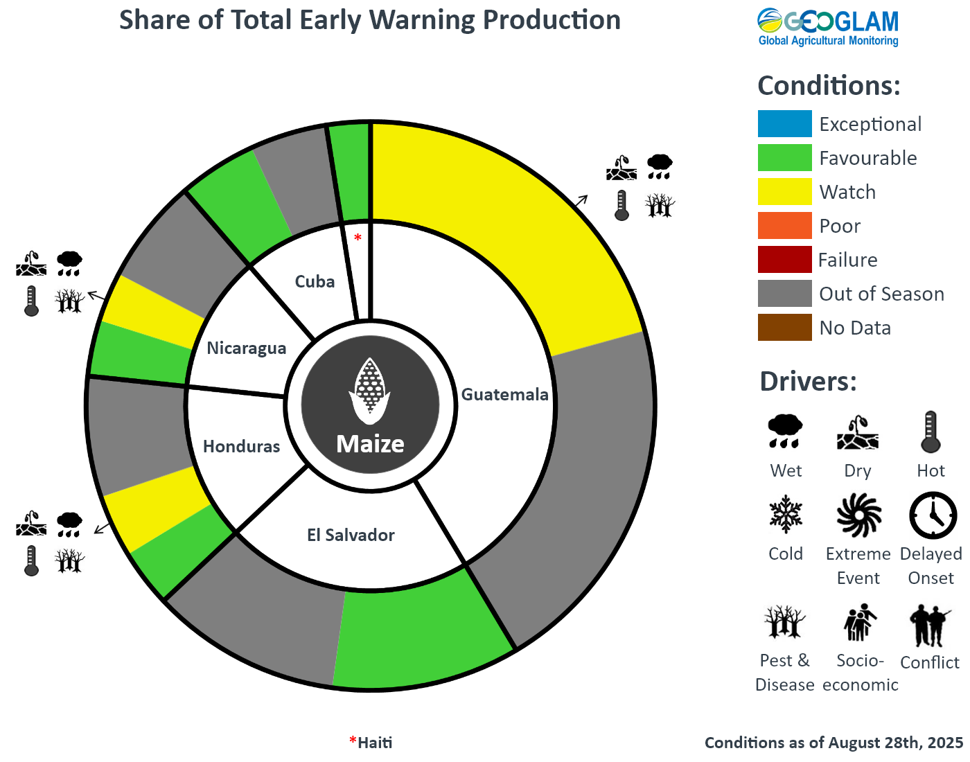 Pie Chart Description: Each slice represents a country’s share of total regional production. The proportion within each national slice is colored according to the crop conditions within a specific growing area; grey indicates that the respective area is out of season. Sections within each slide are weighted by the sub-national production statistics (5-year average) of the respective country. The section within each national slice also accounts for multiple cropping seasons (i.e. spring and winter wheat) and are a result of combining totals from multiple seasons to represent the total yearly national production. When conditions are other than favourable icons are added that provide information on the key climatic drivers affecting conditions.
