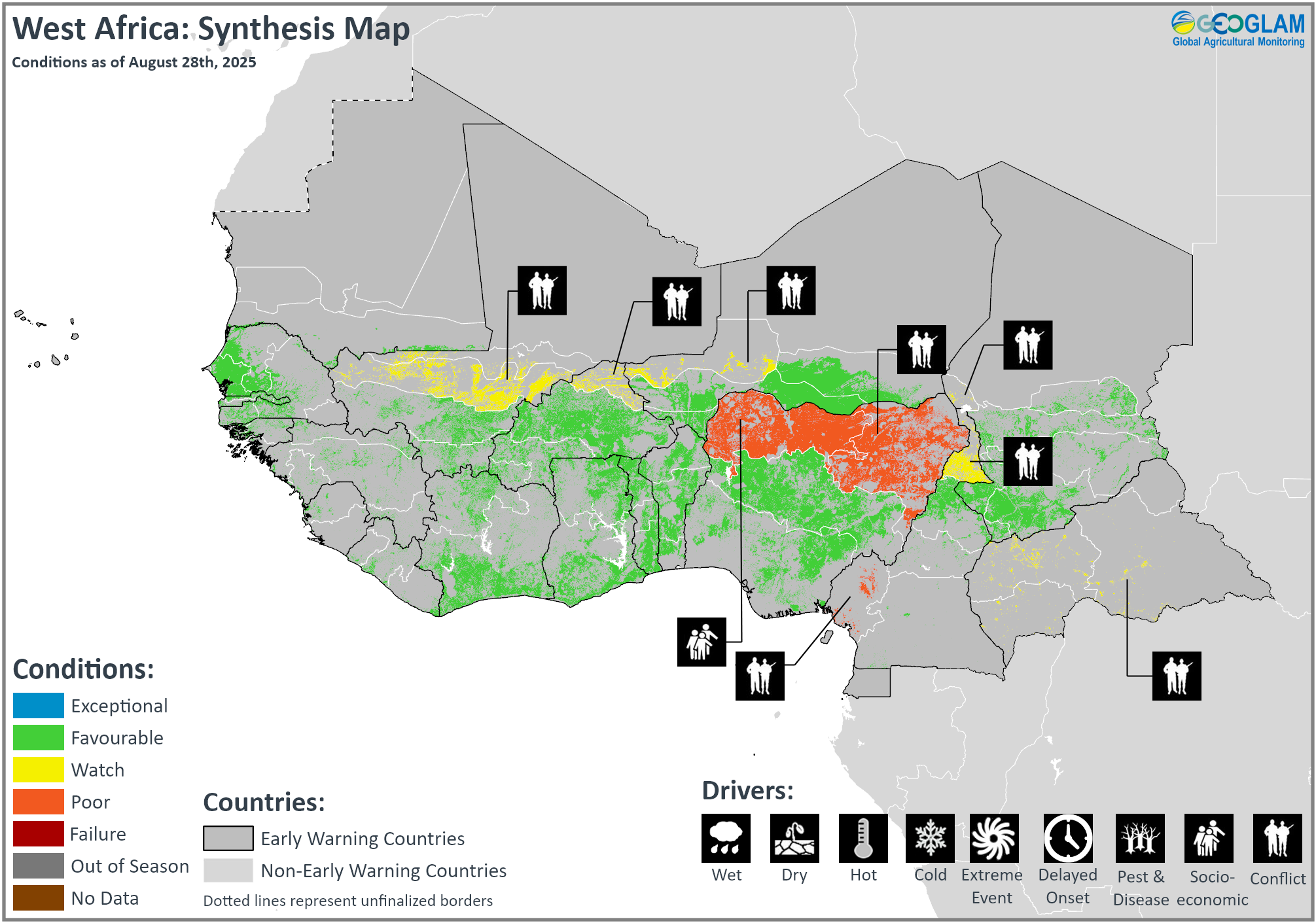 In West Africa, agro-climatic conditions are generally favourable as harvesting ramps up along the south, though concern remains in conflict-affected areas.