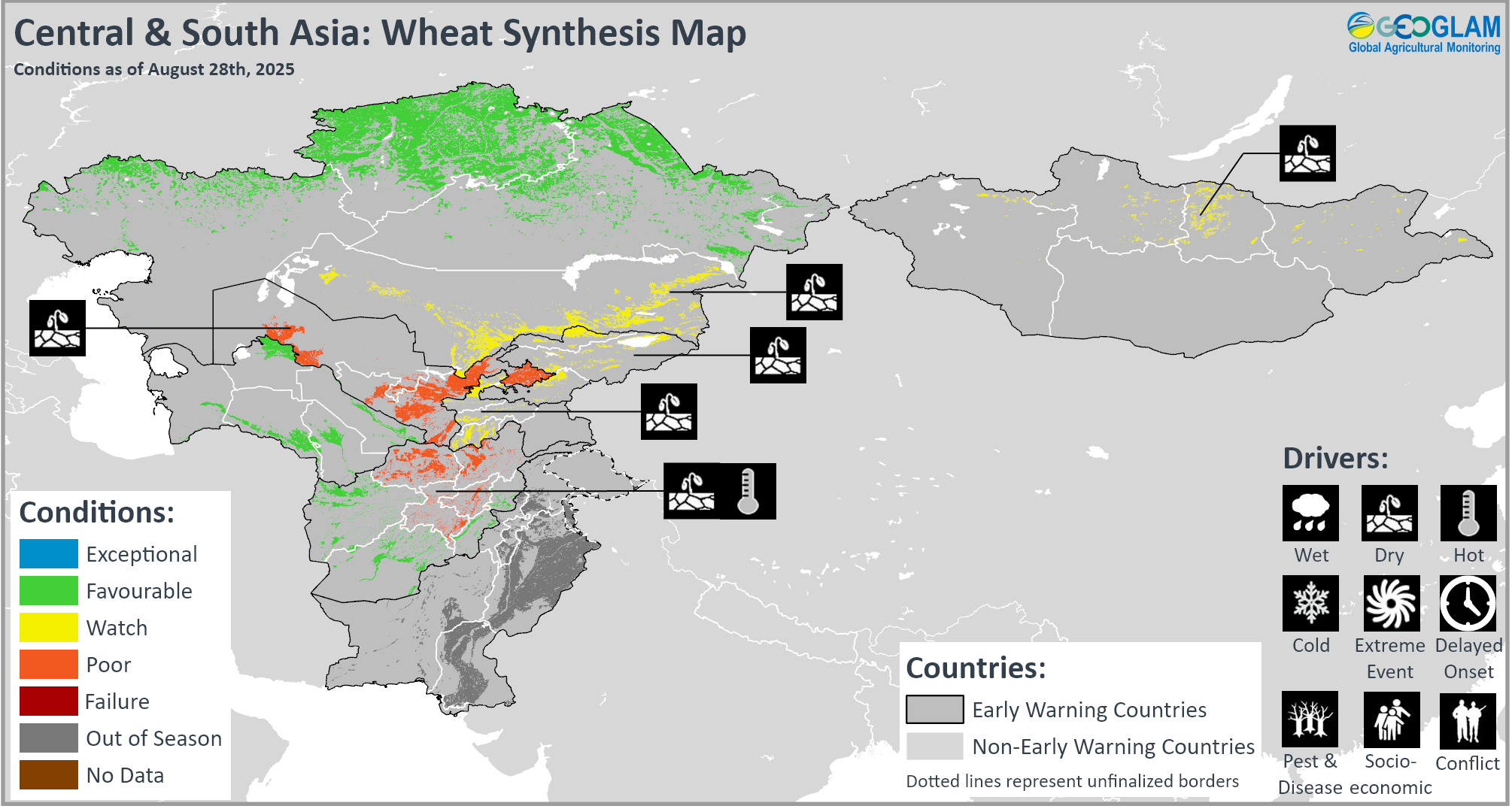 Crop condition map synthesizing wheat conditions as of August 28th. Crop conditions over the main growing areas are based on a combination of inputs including remotely sensed data, ground observations, field reports, national, and regional experts. Crops that are in other than favourable conditions are labeled on the map with their driver.