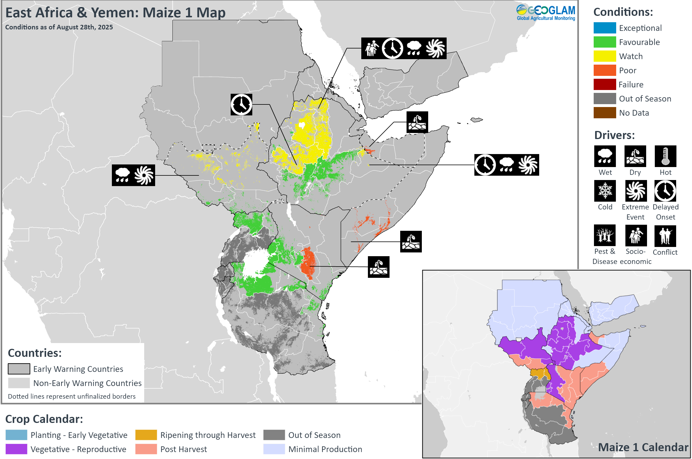 Crop condition map synthesizing Maize 1 crop conditions as of August 28th. Crop conditions over the main growing areas are based on a combination of inputs including remotely sensed data, ground observations, field reports, national, and regional experts. Conditions that are other than favourable are labeled on the map with their driver.