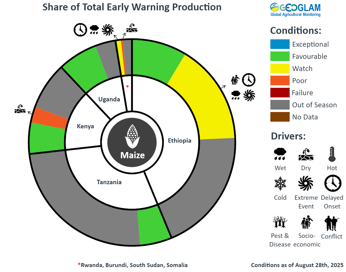 Crop condition map synthesizing Maize 2 conditions as of August 28th. Crop conditions over the main growing areas are based on a combination of inputs including remotely sensed data, ground observations, field reports, national, and regional experts. Conditions that are other than favourable are labeled on the map with their driver.