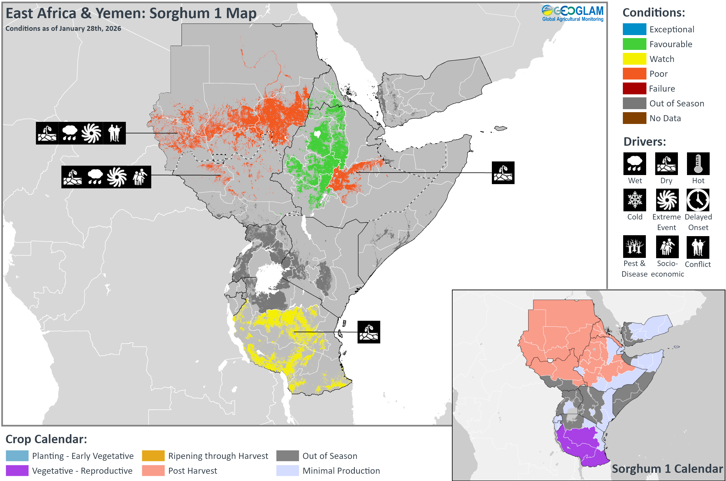 Crop condition map synthesizing Sorghum 1 conditions as of January 28th. Crop conditions over the main growing areas are based on a combination of inputs including remotely sensed data, ground observations, field reports, national, and regional experts. Conditions that are other than favourable are labeled on the map with their driver.