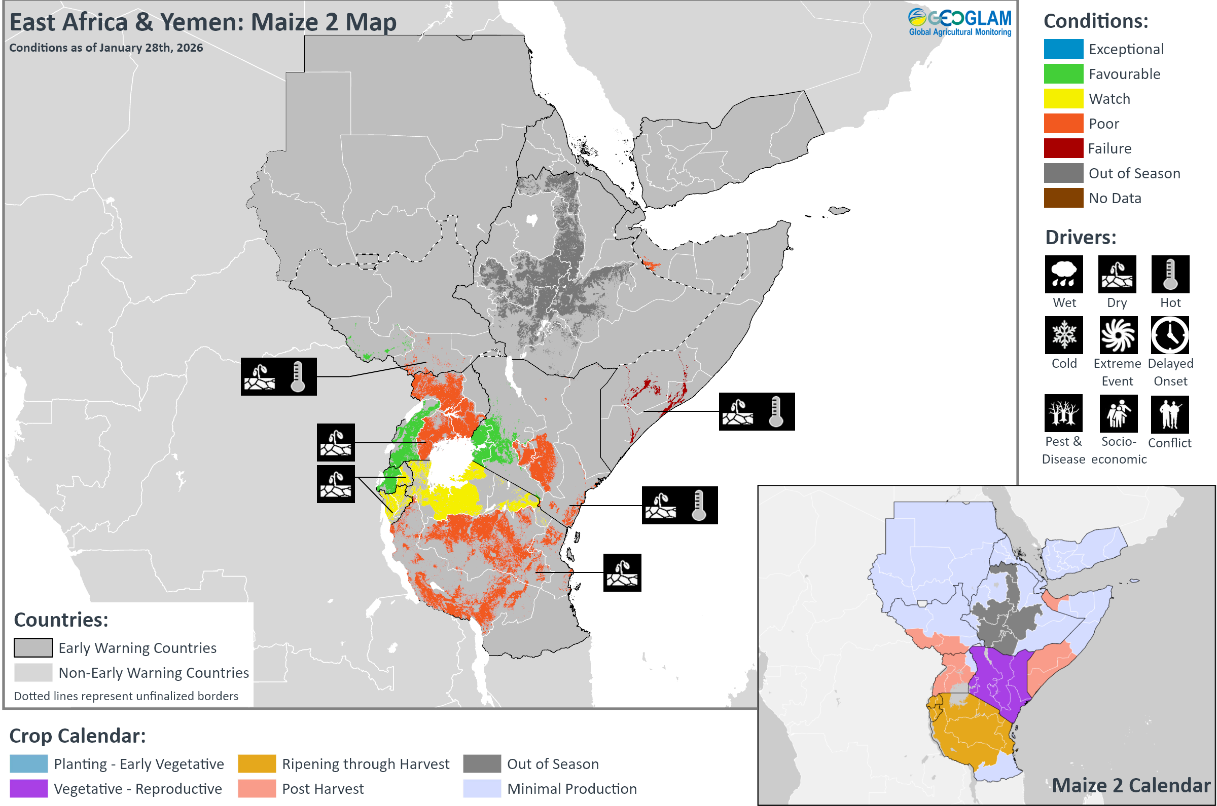 Crop condition map synthesizing Maize 2 conditions as of January 28th. Crop conditions over the main growing areas are based on a combination of inputs including remotely sensed data, ground observations, field reports, national, and regional experts. Conditions that are other than favourable are labeled on the map with their driver.